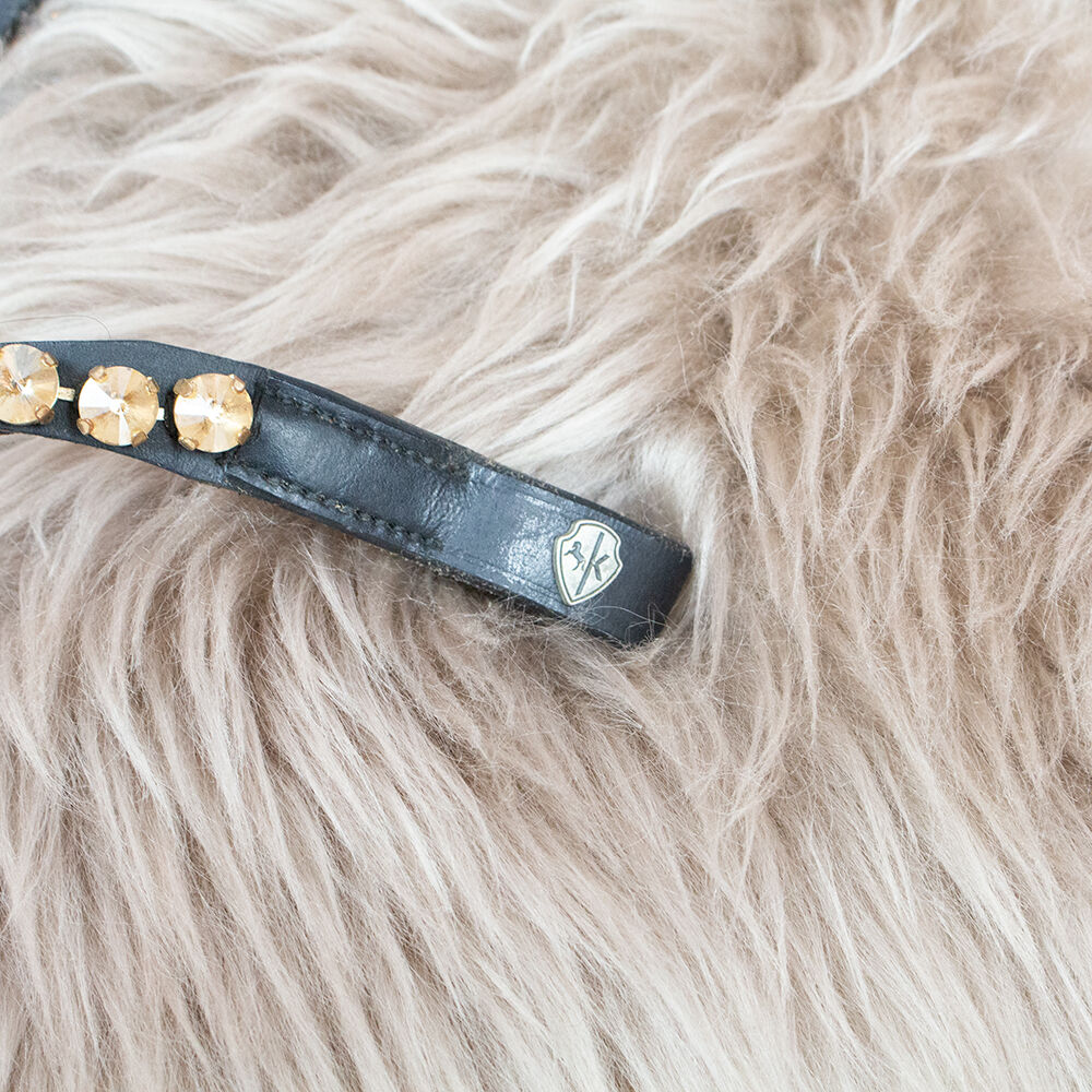 böjt pannband guld XL WB - Det här gyllene pannbandet är ett riktigt blickfång. Det fina läderbrynbandet har stora guldstenar som får det att glittra extra starkt i solen. Det böjda pannbandet är perfekt för träning eller tävlingar. Det är storlek WB. Pannbandet har tecken på slitage. To the seller's offerlaunch
