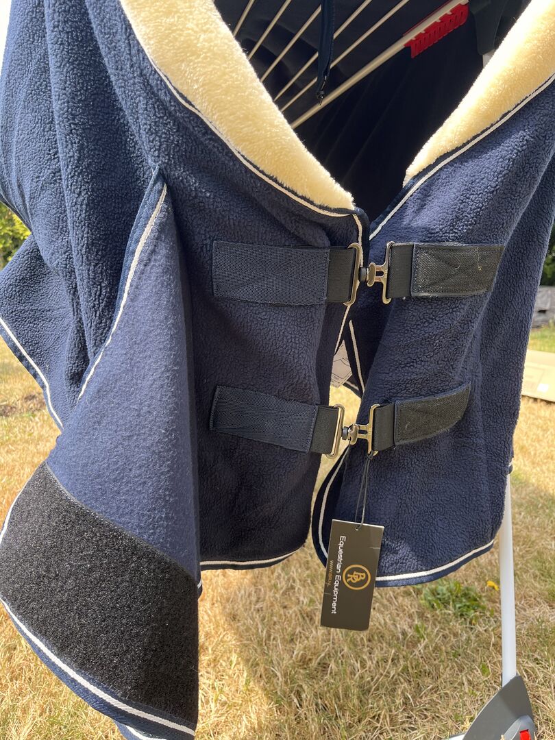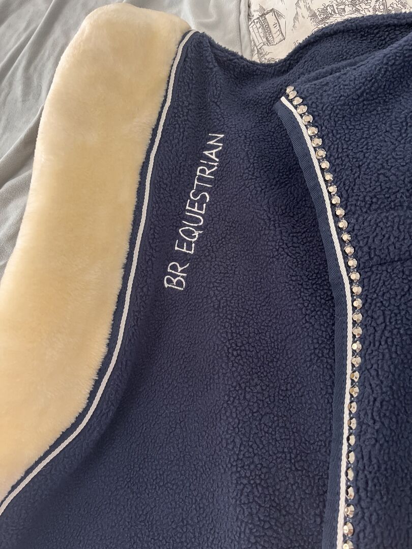 Produktbeskrivning -Storlek: 135cm -Yttermaterial: 380g fleece, 100% polyester - Anatomiskt formad - Syntetisk lammskinnskrage - 2 bröstförslutningar med en klaff med kardborreband över den - Avtagbara korsbågar - Svansrem - Dekorerad med kontrasterande passpoal och smarta nitar