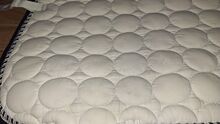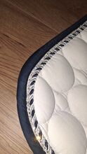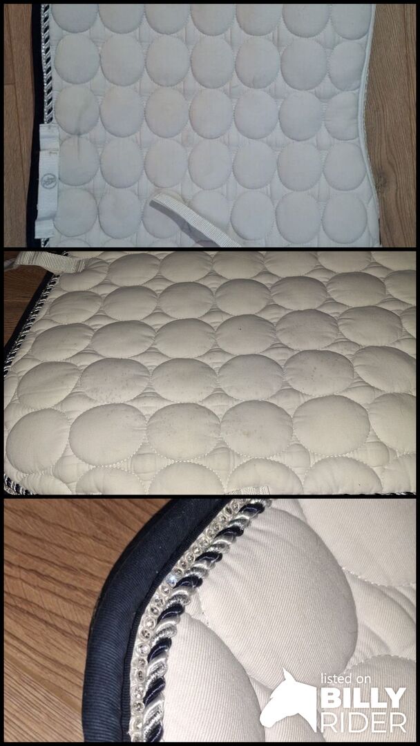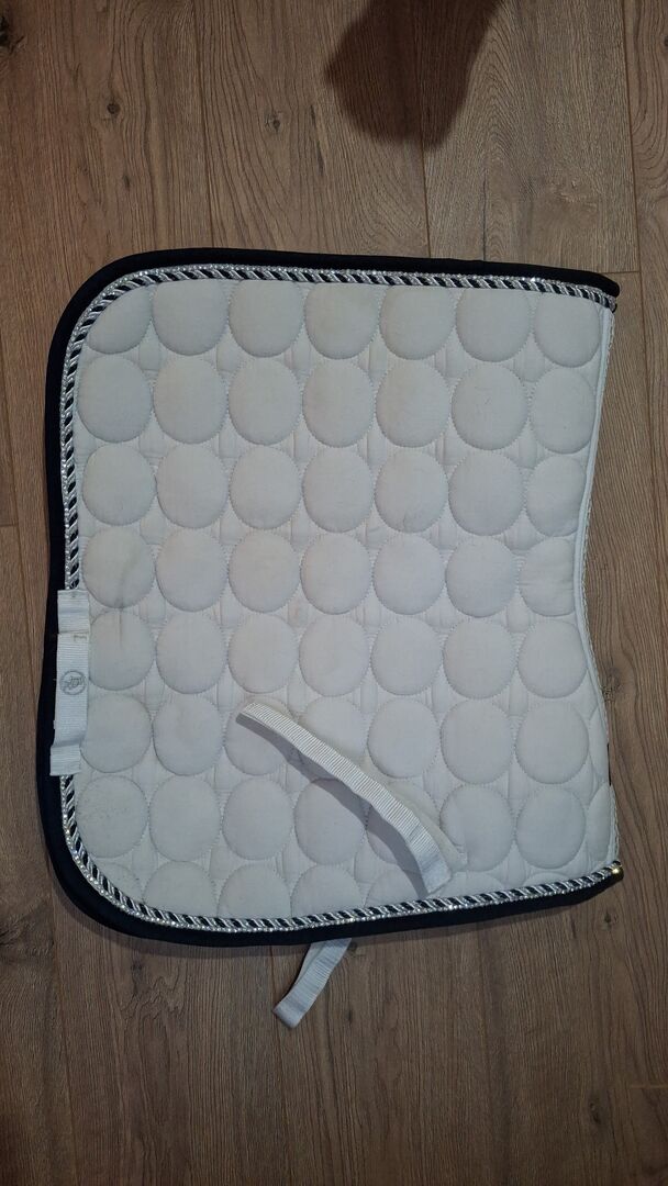 BR Saddle Pad - Vitt schabrak med mörkblått från BR, kanske använt på 1 eller 2 utställningar. Tyvärr fel storlek, är märkt DR/COB. Skicket är fortfarande mycket bra med undantag för en flagning på en av sidorna, men det märks inte under sadeln.