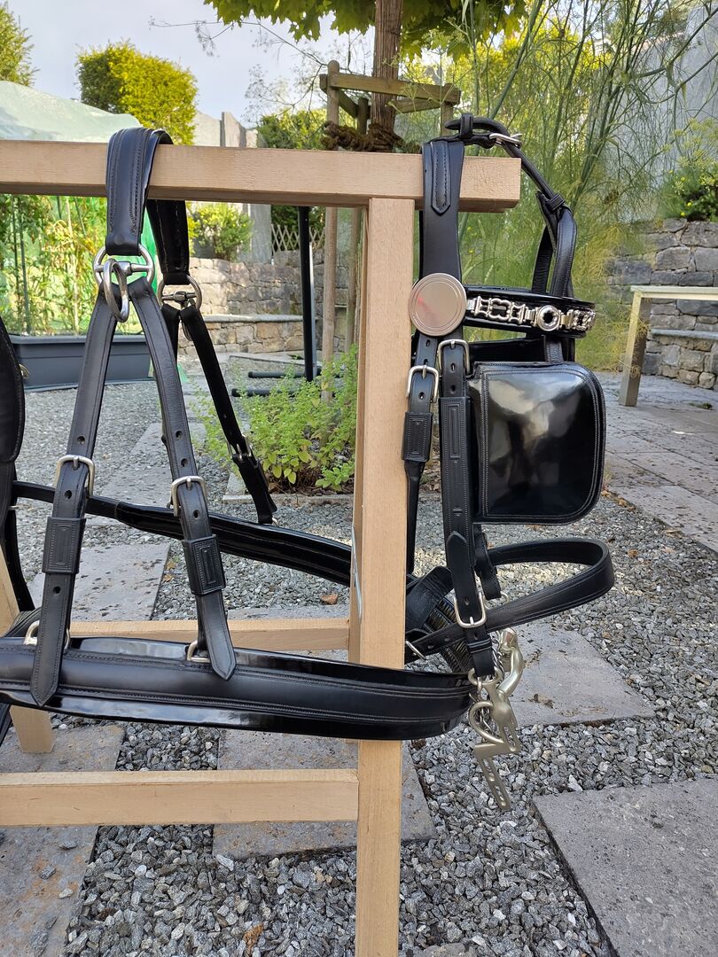 Bröstplåtsele för en häst - Högkvalitativ enkel häst bröstplatta sele med många dekorationer till salu. Bröstplatta och hantering fodrad med patentläder. Inklusive huvudstycke, bett och ledningar, samt skabbband och bäröglor för byte och adapter med säkerhetshakar för dragremmarna.