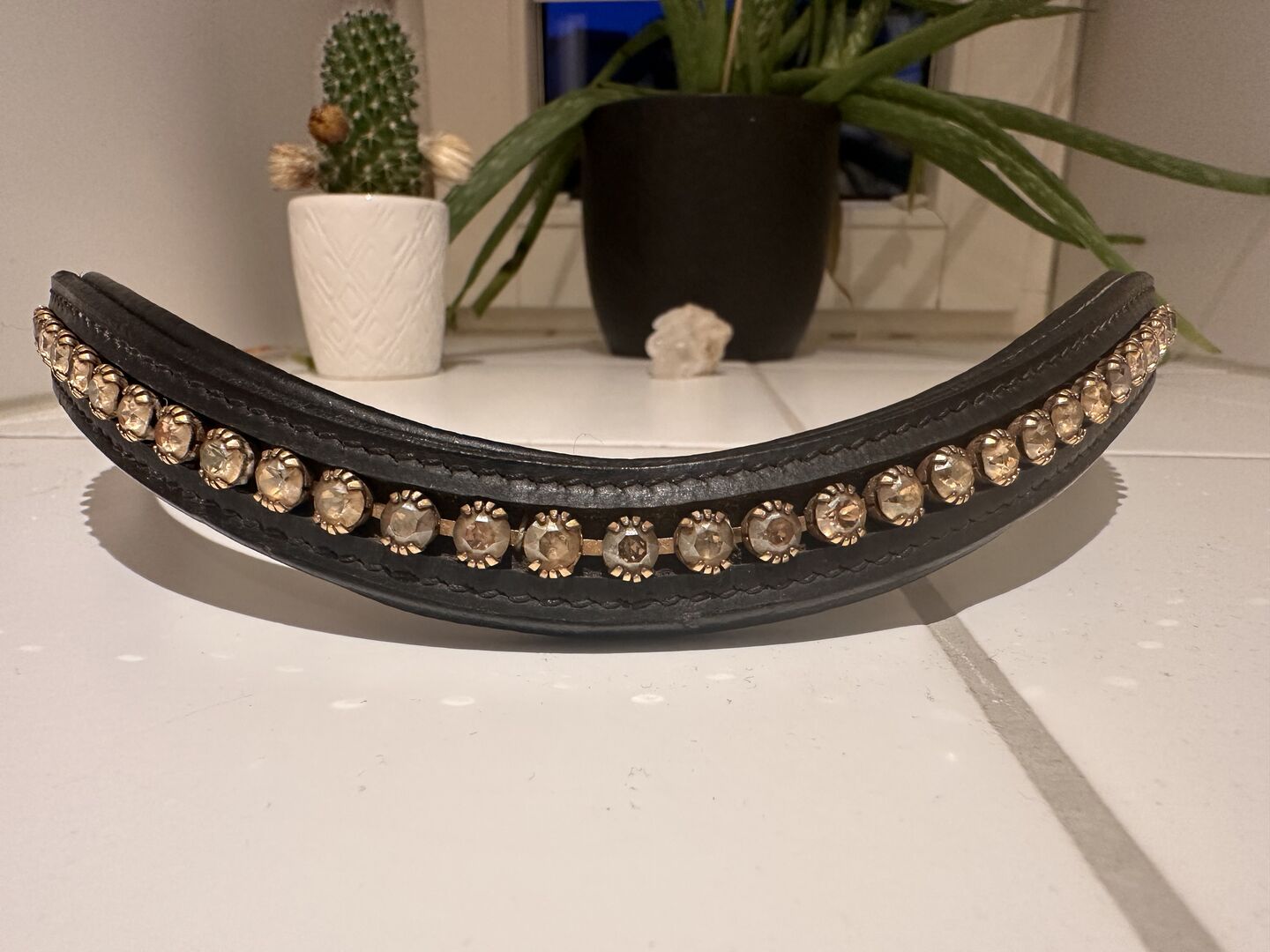 Browband Ascot WB - Vackert pannband, storlek WB (43cm). Mycket mörkbrunt, nästan svart. Guldglittrande stenar.