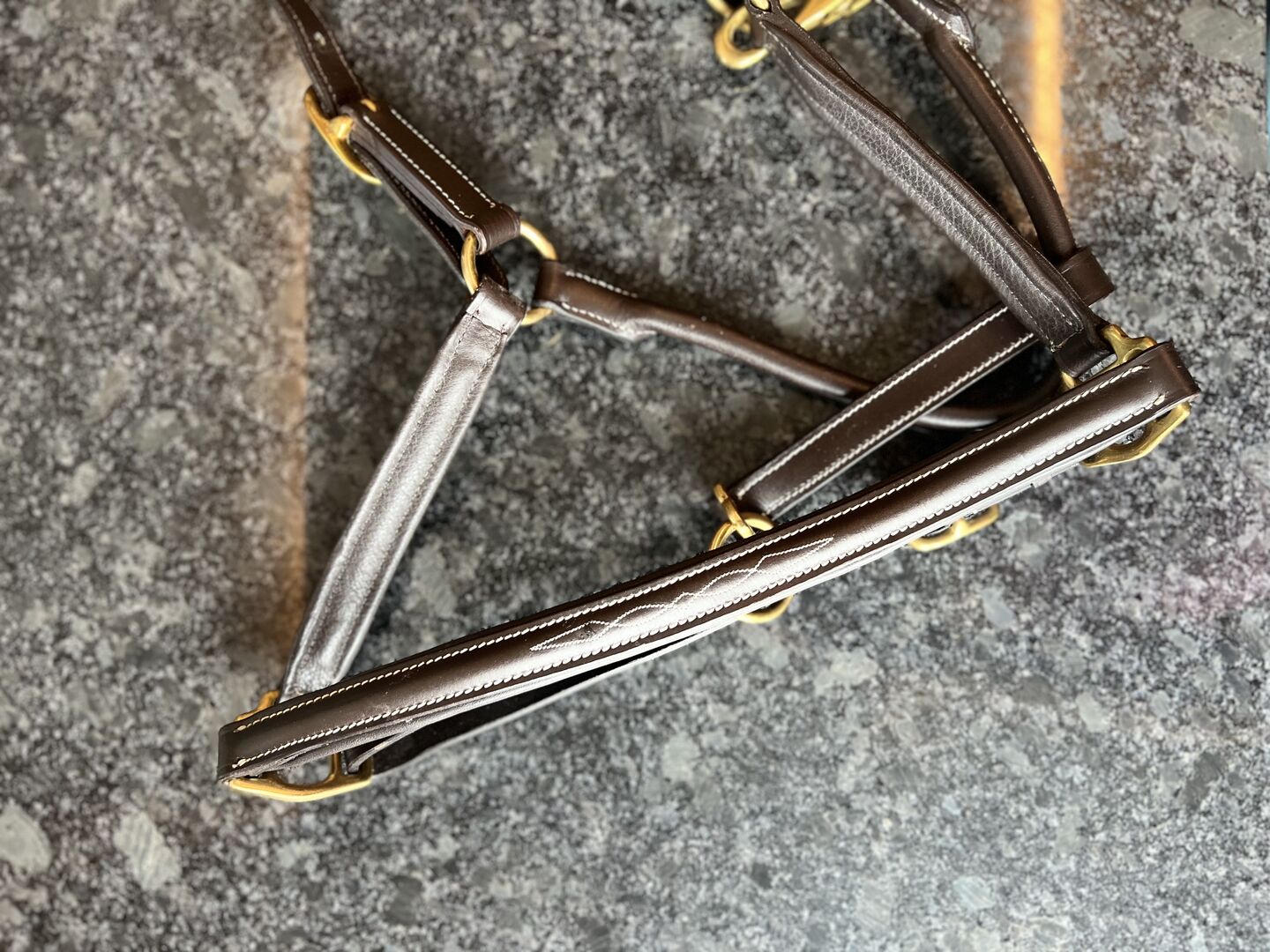 Brun läderhalster storlek WB - Tack för ditt intresse! Till salu är en ny, oanvänd lädergrimma i brunt med vita dekorativa sömmar. Den har aldrig använts eftersom den inte passar min häst. Grimman är justerbar i storlek och är ett riktigt blickfång tack vare de eleganta dekorsömmarna. Perfekt för alla som vill ge sin häst en speciell accessoar.