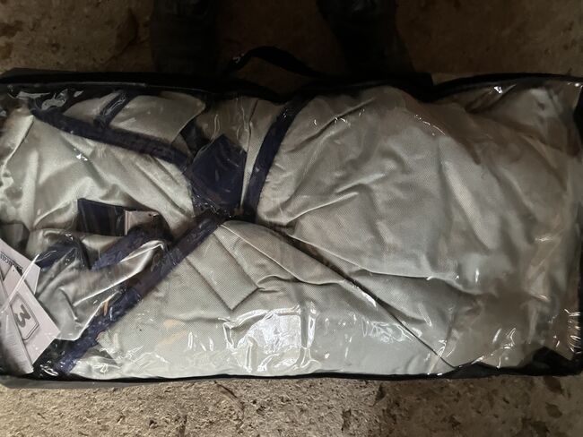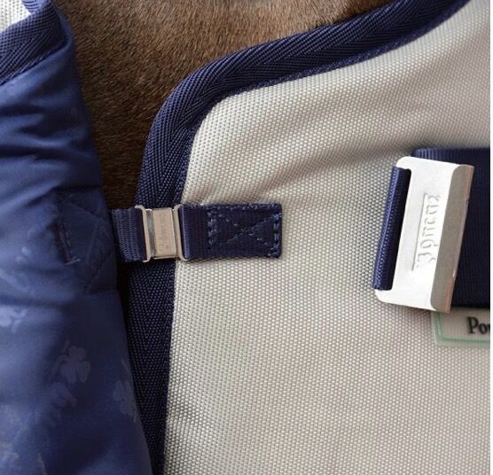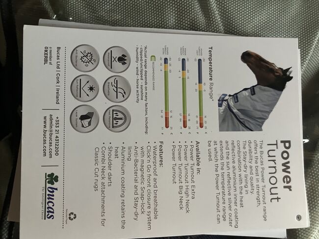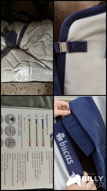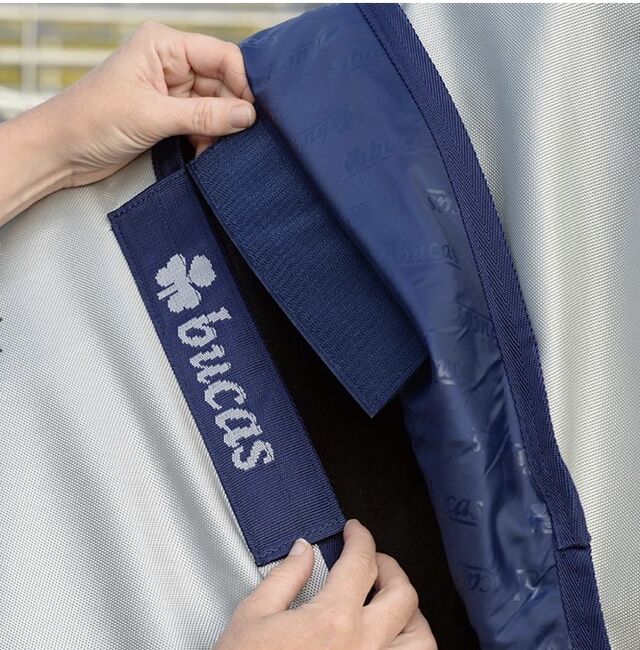 vattentät och andningsbar Power Turnout, 300 g stay-dry fleecefoder, ingen fyllning Power Turnout Extra, 300 g stay-dry fleecefoder på insidan, 300 g fyllning Silverfärgat yttermaterial, solreflekterande Yttermaterial av ballistisk nylon Click'n Go-system med magnetiskt snäpplås "Stay-dry" innerfoder med antibakteriell finish Solreflekterande aluminiumbeläggning Axelveck för ökad rörelsefrihet Korsade remmar Foder med silkeskänsla i axelområdet Remmar för benen Flik för stjärtpartiet Rem i svans Kardborreknäppning för halsstycke (endast Classic Cut) Kompatibel med alla BUCAS täcken och kylboxar Färg: silver Privat försäljning ingen garanti eller garanti