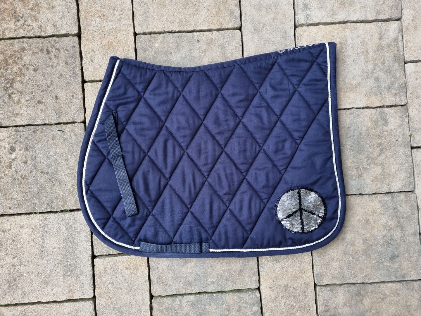 BUSSE-sadelunderlag med vändbara paljetter - Till salu lite sliten BUSSE schabraket med vändbara paljetter (se bilder för motiv). Schabraket är i mycket bra skick utan fläckar eller hål. Schabraket har tvättats nyligen.