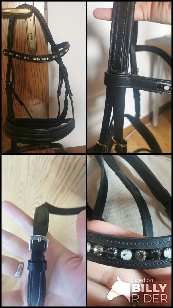 Busse/ Solibel Snaffle Comfort i WB - Liten begagnad träns i storlek WB. - Slätt pannband med stenar (en har en liten fläck - se bilder). - Engelska kombinationsnäsband med ton i ton underlag - Caveson löper över nackstycket - bandtyglar med eftermonterade tryckknappar ingår