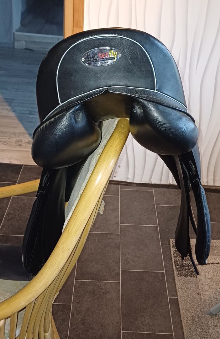 Butterfly hoppsadel 17 tum - Jag säljer min fjärilshoppningssadel i gott skick bakre paneler har tagits bort men kan sättas tillbaka vid behov (kommer att ges med) Sadeln köptes 2020 och har bara varit på hästen fem till sex gånger hittills.