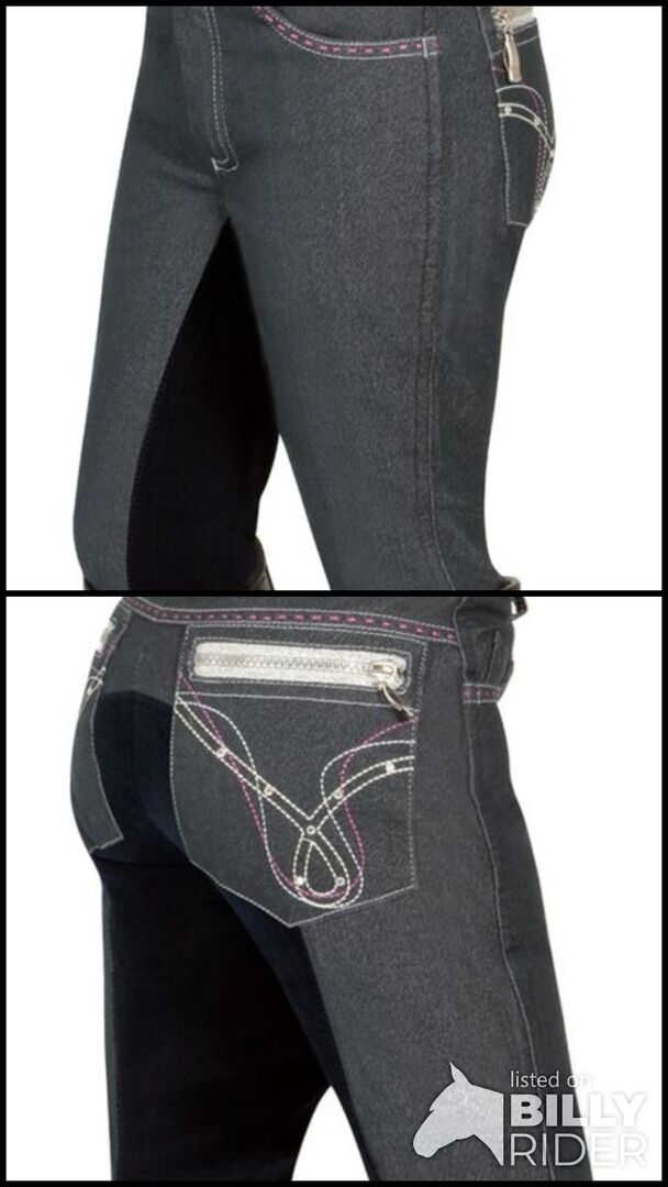 Byxor för barn 176 - Moderiktiga, högelastiska byxor i jeanslook för barn med helt tvättbar kant i konstläder, bälteshällor och framfickor Bakfickorna har dragkedja och är broderade med strassstenar. Färgkoordinerade sömmar i linningen och på fickorna med slits