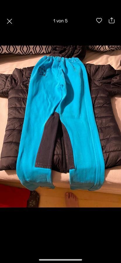 Byxor och basebollkeps - Säljer ett par ridbyxor i mycket gott begagnat skick i storlek 164 i turkos med svart kant. dessutom finns en matchande baseballkeps med hästmotiv i storlek 54/56, som är så gott som ny, då den endast burits två gånger. Frakt möjlig mot en extra avgift