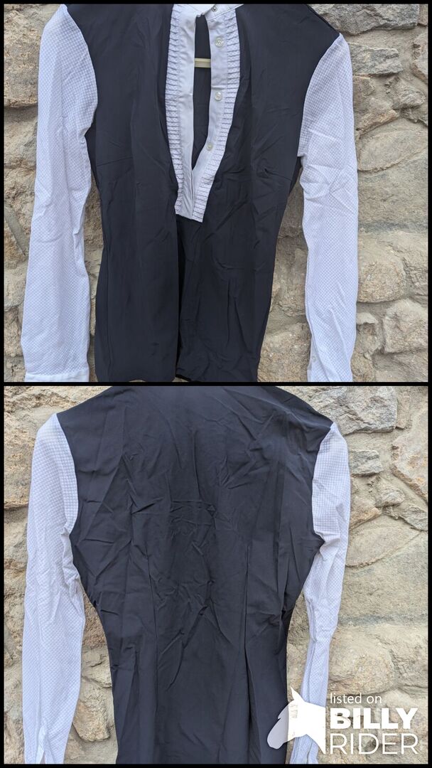 Cavalleria Toscana tävlingsblus - Till salu en chic långärmad tävlingsblus av märket Cavalleria Toscana i färgen marinblå / vit i storlek M. Blusen har ett superbra tyg och är super bekvämt att bära. Ärmarna andas så att du också kan bära den här fantastiska blusen på utställningen på sommaren.