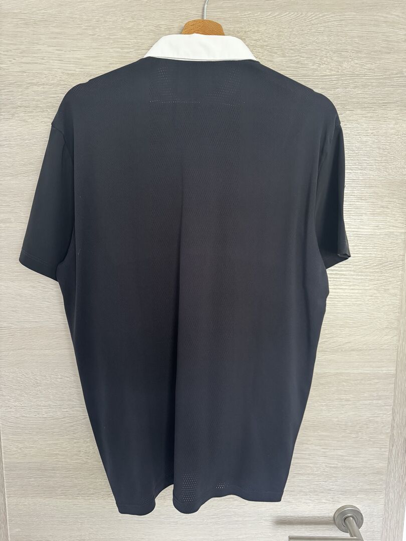 Till salu finns en högkvalitativ och snygg tävlingströja för herrar från Cavalleria Toscana x RG Italy i svart med vit krage och fina logodetaljer i guld. Skjortan är kortärmad, kroppsnära skuren (slim fit) och har endast sällan burits - skicket är helt felfritt.
