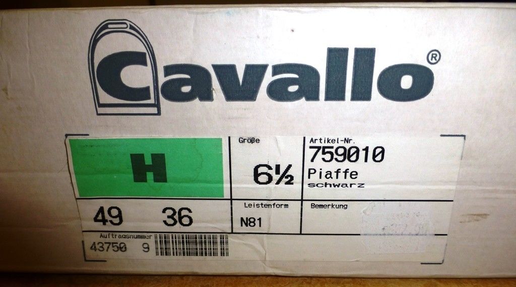Cavallo ® Piaffe dressyr läder ridning boot storlek 6.5 H49 W36 Ny OVP - Till salu ett par nya original Cavallo® dressyrridstövlar modell "Piaffe" med svart läderyttersula och dubbade klackar, för den eleganta dressyrryttaren. Dressyrstöveln har en vacker, hög, böjd dressyrbåge och en guldfärgad Cavallo-logotyp. Märkesstöveln är Goodyear®-svetsad och tillverkad av fint franskt boxcalf-överläder; komfortfotbädd. Levereras i originalkartong. Skick: ny, endast provad, sulan därför med små märken. Storlek: 6,5 (enligt Cavallo tabell = 40); Skaft: höjd 49cm (utan dressyrbåge), vad 36cm typ "H" (för mer se stämpel på insidan).