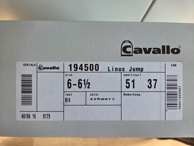 Märke: Cavallo - Modell Linus Jump - Storlek: 6-6,5 - Skafthöjd: 51 cm - Bredd på vaden: 37 cm - Färg: svart - ursprungspris: 299 € - Originalförpackning finns tillgänglig - Stövelträd ingår