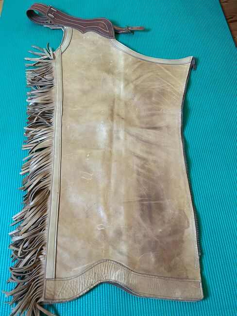 Chaps tillverkade av tjockt kohud för långa, smala ryttare - Vackert tillverkade, begagnade chaps i mycket tjockt läder med rejäl dragkedja för långbenta, smala ryttare. Mått på chaps: Midjeband: 69 -77cm + 6 och 12cm remmar, alltså max. 95cm, Längd: utsida ca 83 cm, dragkedja: 74 cm Bredaste omkrets (lår): 55cm Smalaste omkrets (från knäet och ner): 43cm