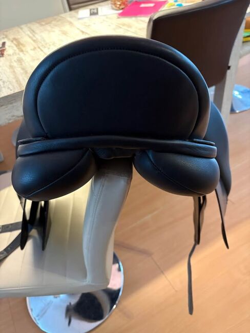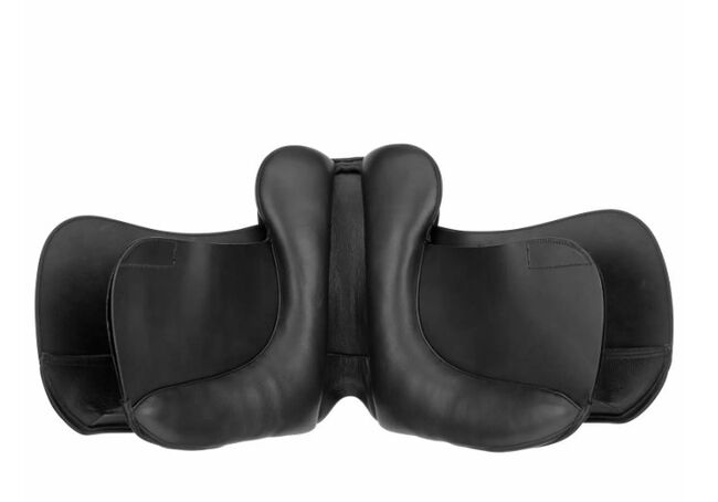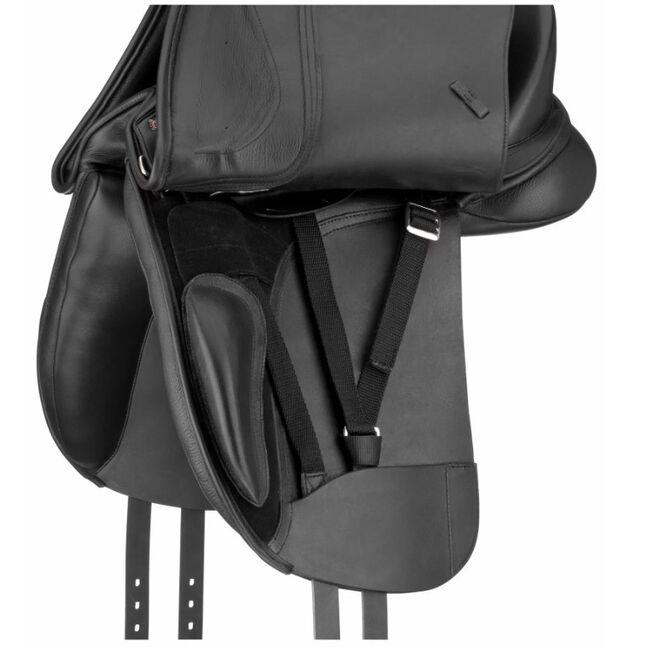 Claridge House dressyrsadel New Generation storlek 17,5, svart - ZGAN - Elegant dressyrsadel i äkta läder med anatomiskt djup sits. Utrustad med en stabil men flexibel sadelbom i syntetmaterial, utbytbar huvudskena och Y-sadelgjordssystem. De breda sadelkuddarna är fyllda med syntetull och ger en optimal tryckfördelning. Sadelgjordarna med kardborreband kan justeras individuellt. Levereras med ett ljusblått (normal, 30 cm), lime (normalbred, 32 cm) och lila (bred, 34 cm) huvudjärn. Den här är i den nu.