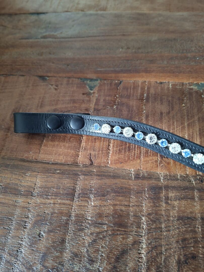 Böjt pannband i äkta läder med stora och små glittrande stenar.