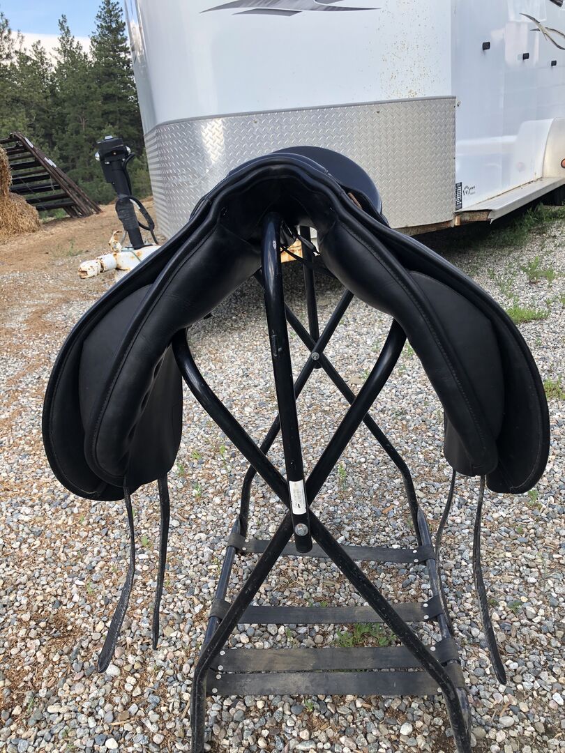 17.5” seat. Currently has med/wide gullet installed and comes with a set of replacement gullets. Has synthetic flocking but can be adjusted by a licensed fitter. Has normal wear and has been stored under a cover in a tack room when not in use.