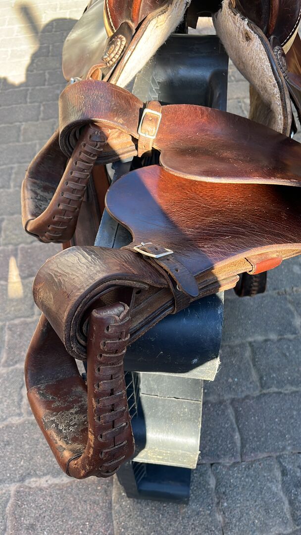 Continental Western Saddle - Tung kontinental westernsadel med extra stigbyglar och ridkudde. Monterad på en quarterhäst som tyvärr blivit för gammal för att bära den tunga sadeln.