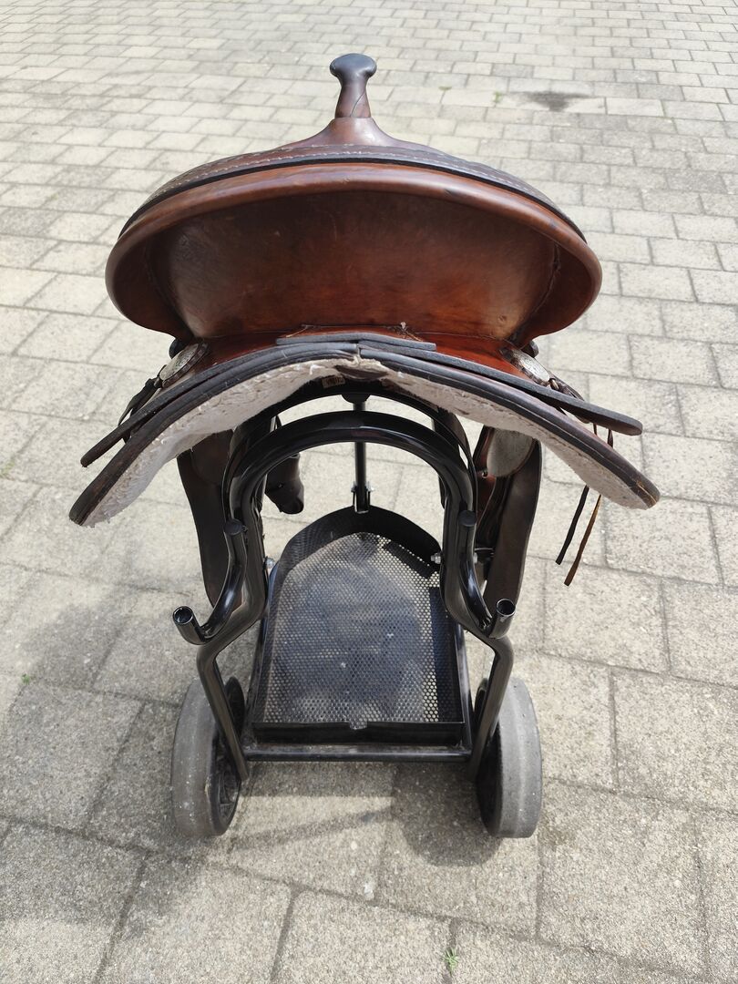 Continental Western Sadel Läder 16 - Continental western sadel i bra skick. Vänligen se bilder för mått. Monterad på en bred kort Berber. Hämtning föredras. Kan tas bort för att prova ut mot deposition av köpeskillingen