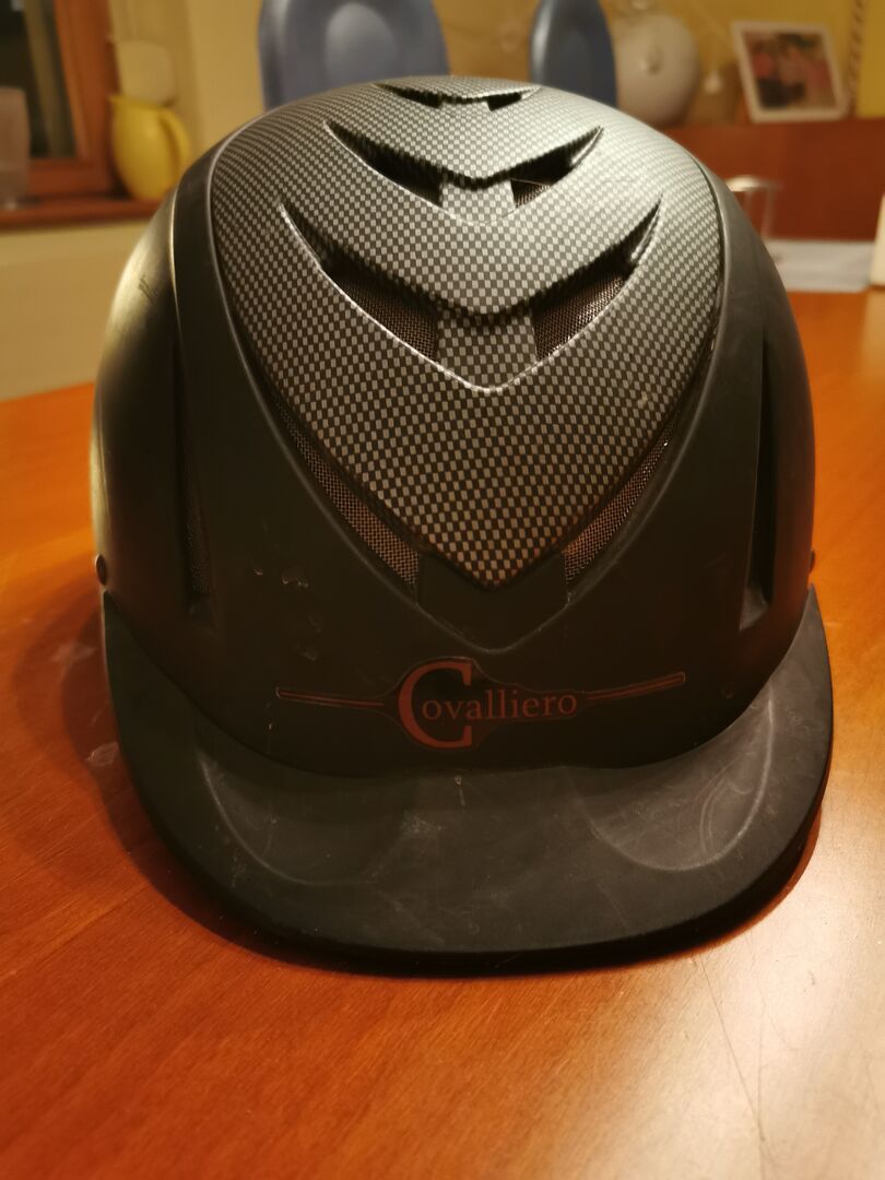 Covalliero Jump! ridhjälm - Ergodynamisk profil med ädel kolfinish. Skivsystem för enhandsjustering av huvudbandet till respektive huvudomkrets. Dessutom kan höjden på huvudringen på baksidan av huvudet justeras med ett klicksystem. Extra hårt hjälmskal av ABS med flexibel hjälmsköld, utmärkt ventilationssystem som ger ett optimalt klimat under hjälmen. Ventilationsslitsar med integrerade insektsskydd. 4-punktsbeslag med högkvalitativa fästanordningar, innerfodret är avtagbart för optimal rengöring. Storlek: 52- 56cm Vikt: ca 500 gram