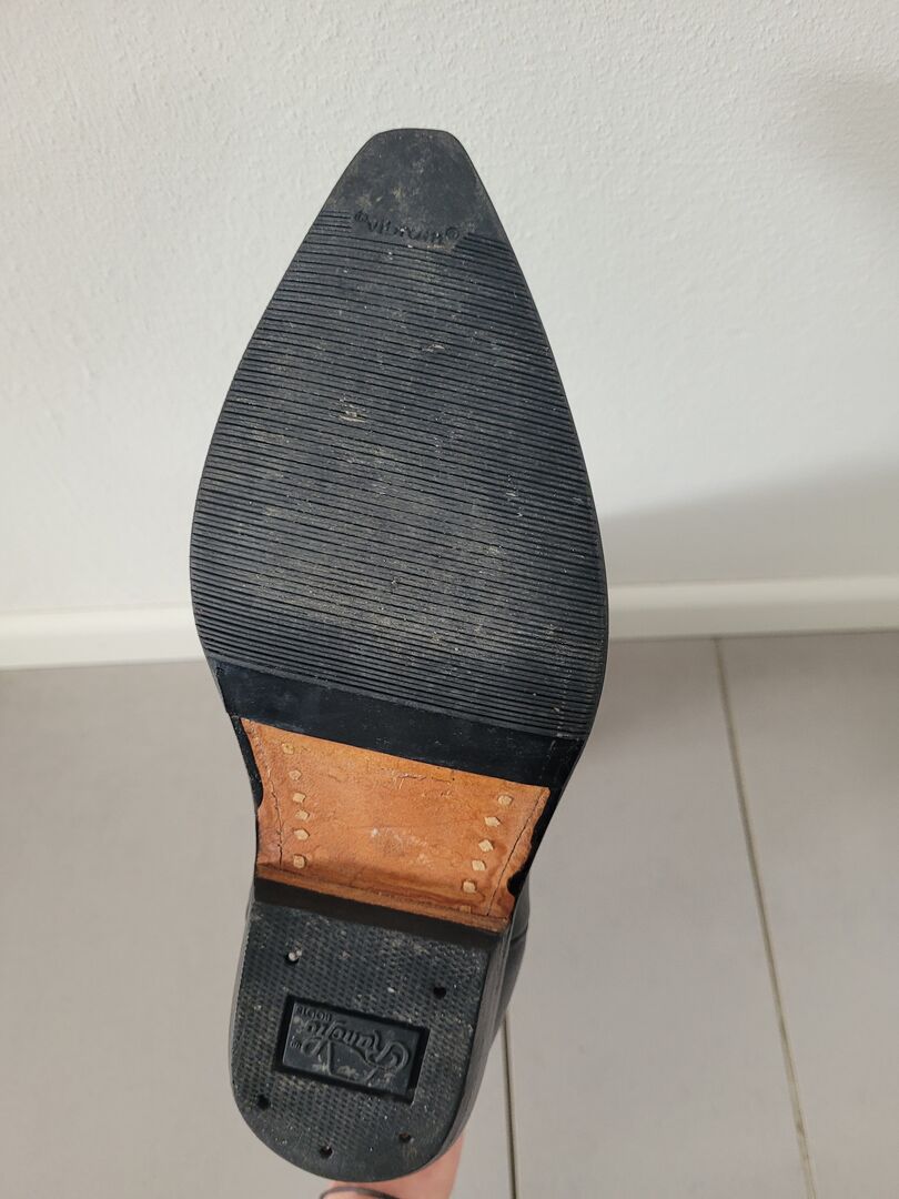 Cowboystövlar, Westernstövlar - Klassiska cowboyboots från Rancho tillverkade av kohud i svart. Kvaliteten präglas av det gamla skomakarhantverket: träpinnade sulor utan spikar och Goodyear-welted-design. Skorna har knappt använts eftersom de är för små för mig. Jag fick en skyddssula monterad av skomakaren redan från början.