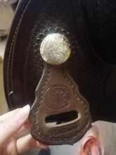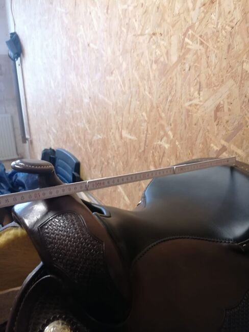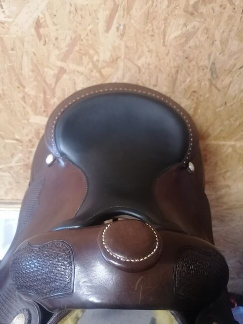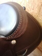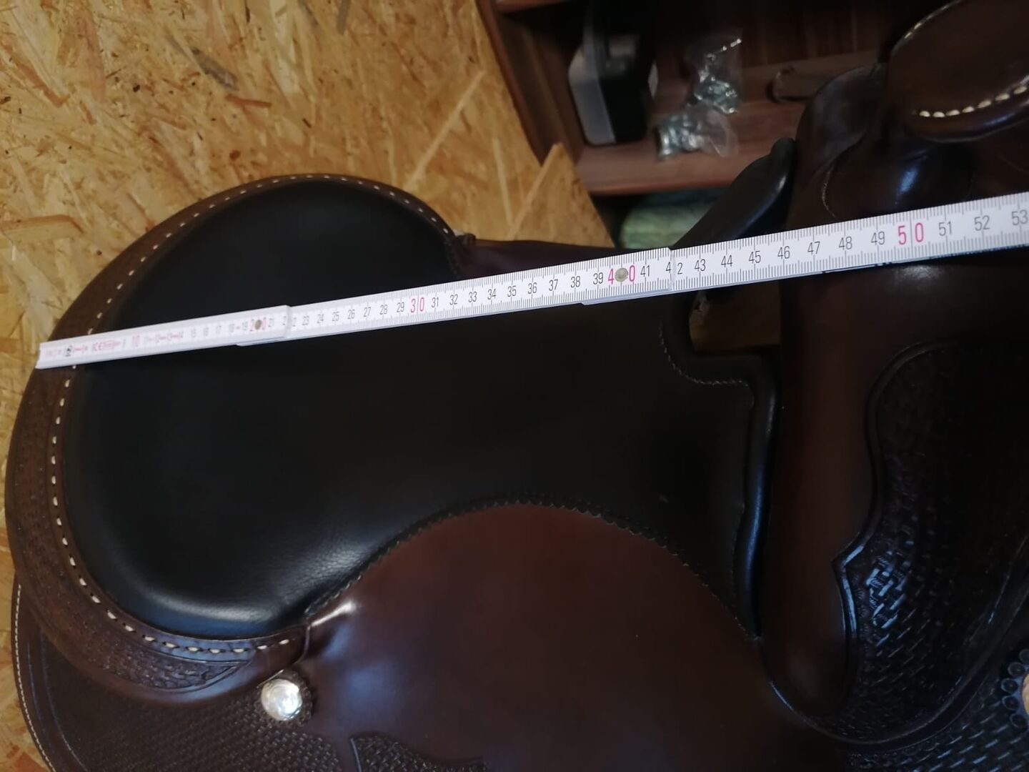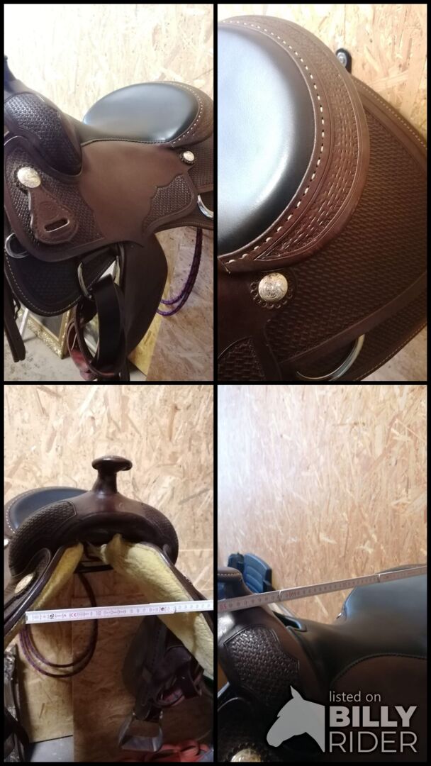 Cully's Pure Western Saddle (Triple W Platinum) - som ny - Jag säljer min mörkbruna reiner western sadel från Cully's Saddlery - en Triple W Platinum. Den är i toppskick (som ny) då den endast användes i några månader eftersom min häst tyvärr dog i kolik kort efter att jag köpt den. Det är därför sadeln nu säljs. Sadeln har alltid förvarats torrt och skyddat. Sitsen är tillverkad av slätt svart läder. Numret under bandhållaren är M899. Sadelns mått framgår av bilderna. Om ytterligare mått eller bilder krävs skickar jag dem gärna till dig.