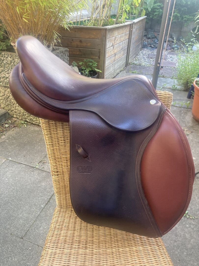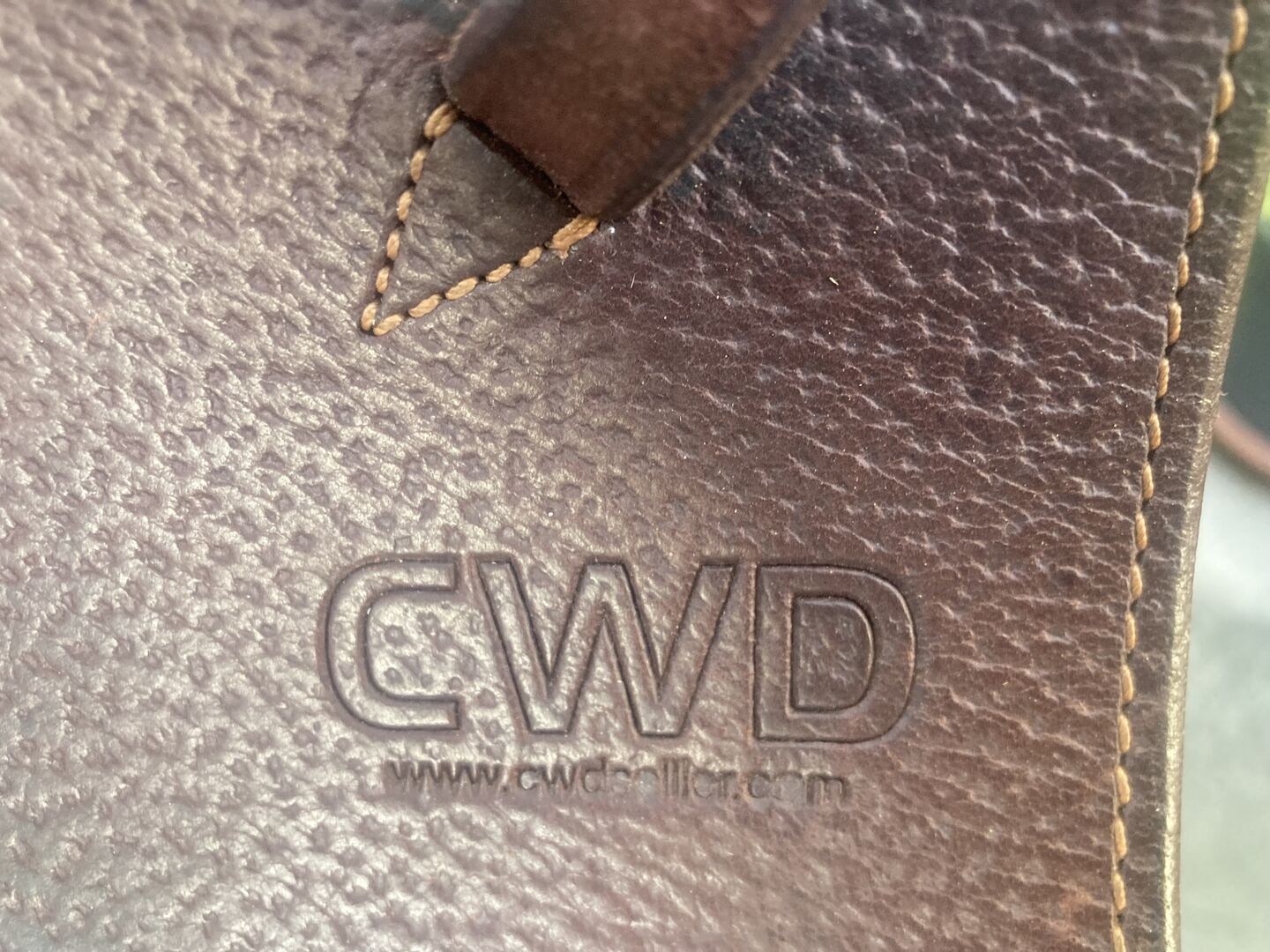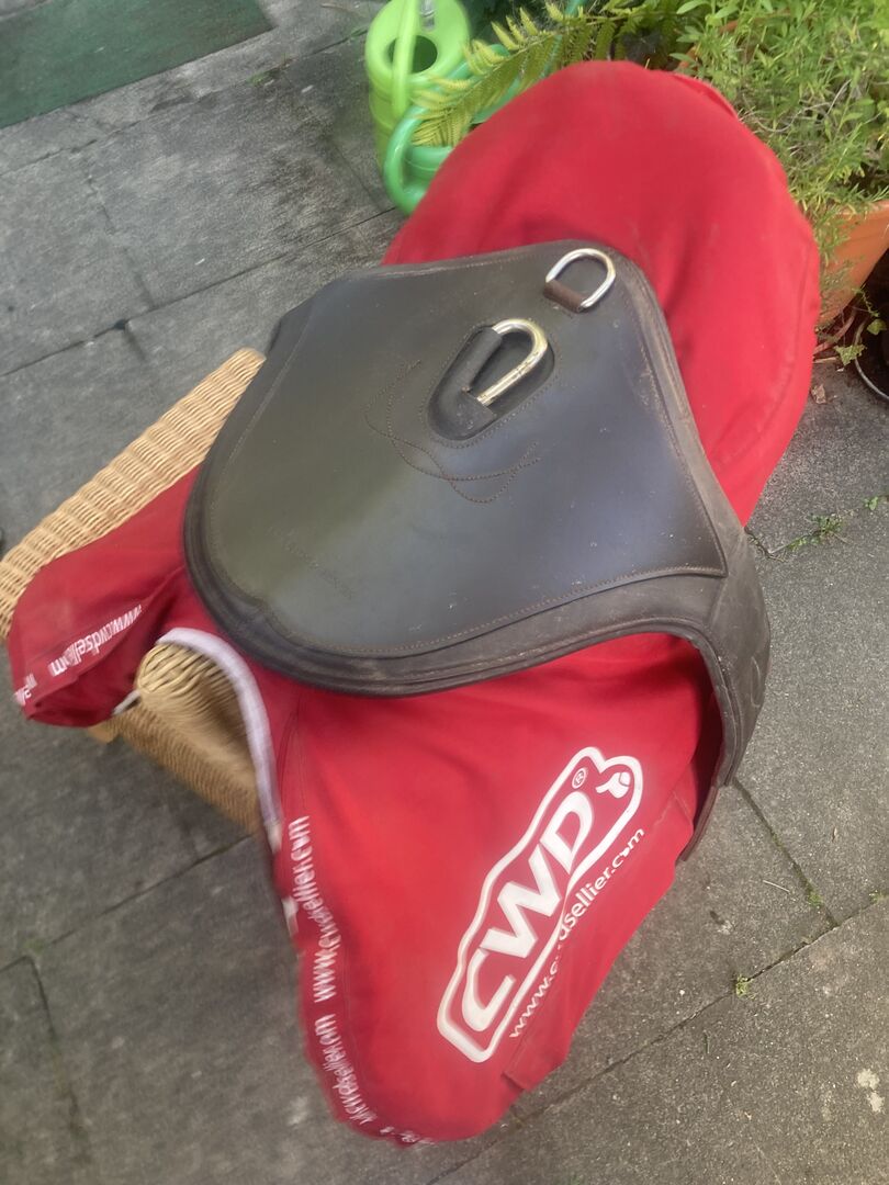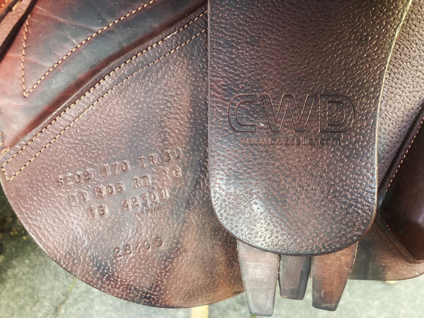 CWD Hoppsadel - CWD SE02 170 TR 3D - 17 tum - Vi säljer en väl underhållen, begagnad CWD-hoppsadel. Sadeln är en CWD SE02 hoppsadel med 17 tums sitsstorlek, tillverkad 2015. Den har en särskilt tättsittande sadelklaff med storlek 3 och ett extra framåtriktat snitt. Skumstoppningen har specialmodifierats med en anpassad panelkod (805) och extra mankavlastning (RG).
