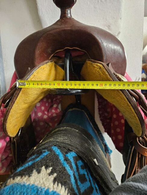 Deuber och Partner Ponnyspecial - Mycket fin, väl underhållen westernsadel. Passar på 132cm bred ridponny med en lätt kurva i ryggen. Kort sadel under 60cm, perfekt för kortare hästar.