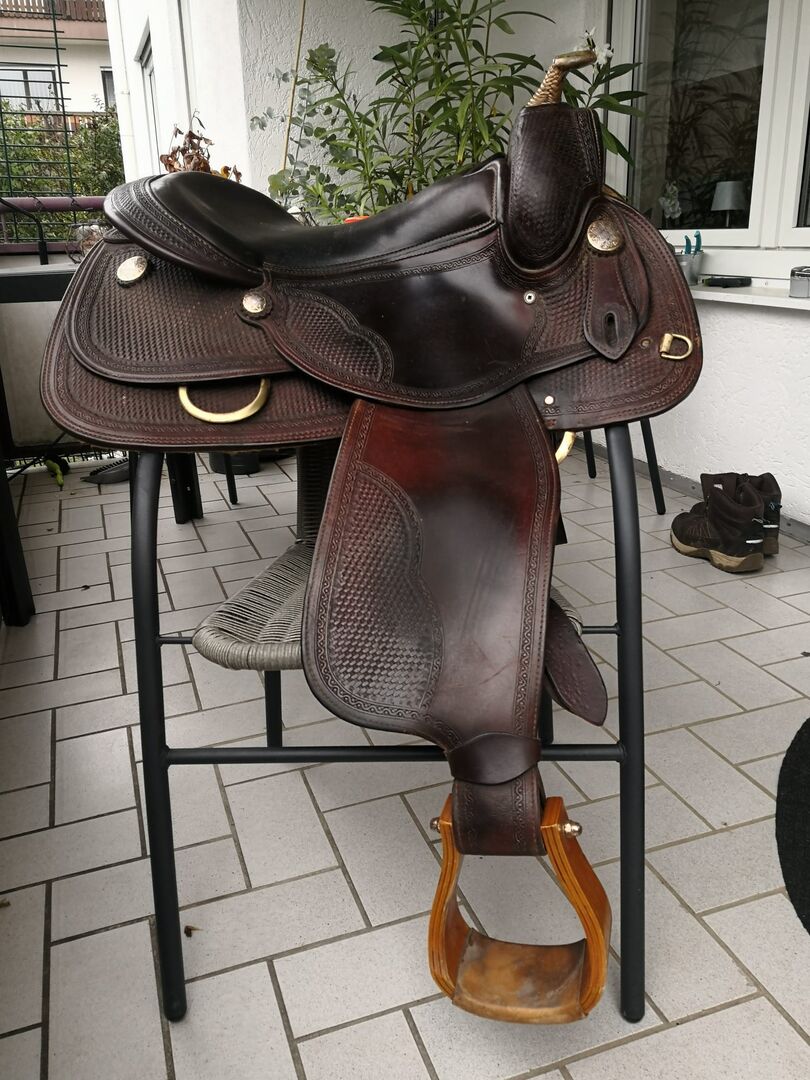 Deuber & Partner (DP) Super bekväm western sadel, 16,5 " - Jag erbjuder en fantastisk DP western sadel. Tyvärr har min häst vuxit ur den och den är nu för smal i axeln. Vi har haft fantastiska långa åk, sadeln är mega bekväm, jag ger träbyglarna, som på bilderna, och min FeatherFlex western girth 32 "från Classic Equine. Upphämtning önskas. Kan även provridas om köpeskillingen deponeras.