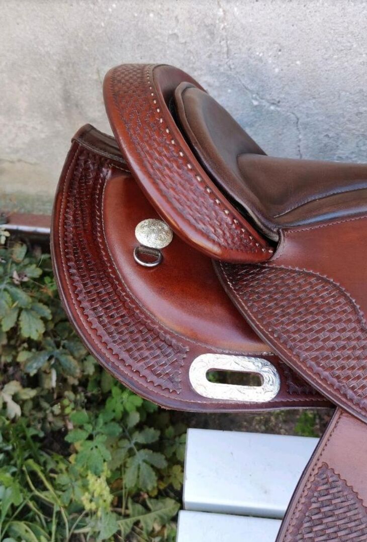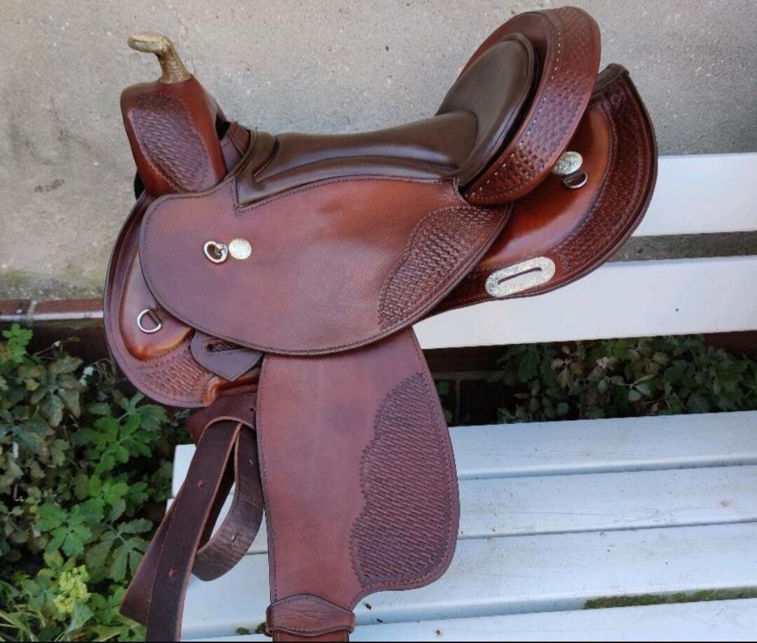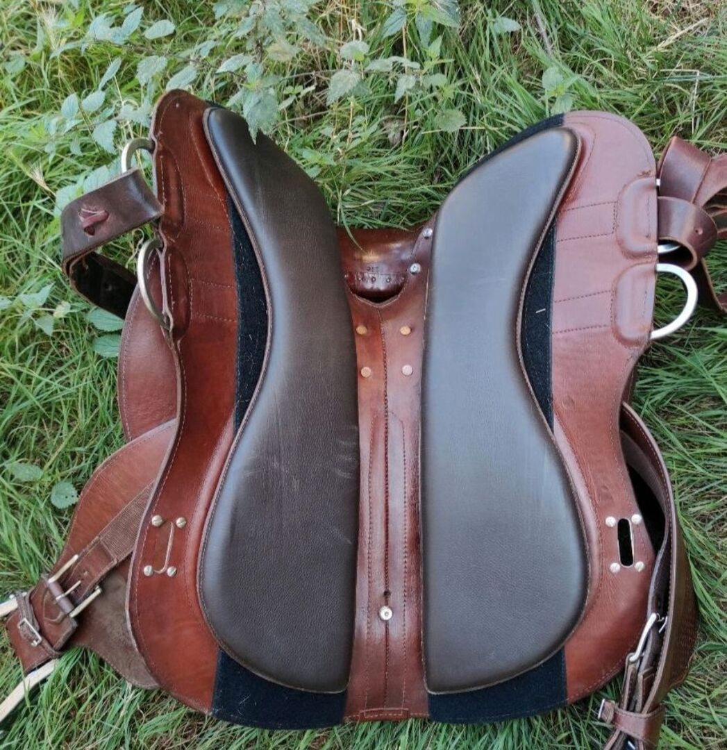 Varumärke: Deuber & Partner Startrekk Modell: Commander Sadeltyp: Treeless western sadel Sitsstorlek: justerbar (ca. 15,5" ca.38,75cm u. 16,5"ca.41,25cm Kontaktyta: 63cm Kardborrebandspaneler: 57-58cm Färg: Havanna Läder: Chesnut-läder Gaffelstorlek: 3S (brant) (3 lämplig för Hafinger, Norwegian, Tinker och andra hästar med en stark och välmusklad rygg, eventuellt också ganska rund) Skick: se bilder mycket väl underhållen inga defekter Särdrag: två ringar på vardera sidan för Y-gjord, justerbar sits, utbytbar gaffel Kardborrkuddarna är så gott som nya