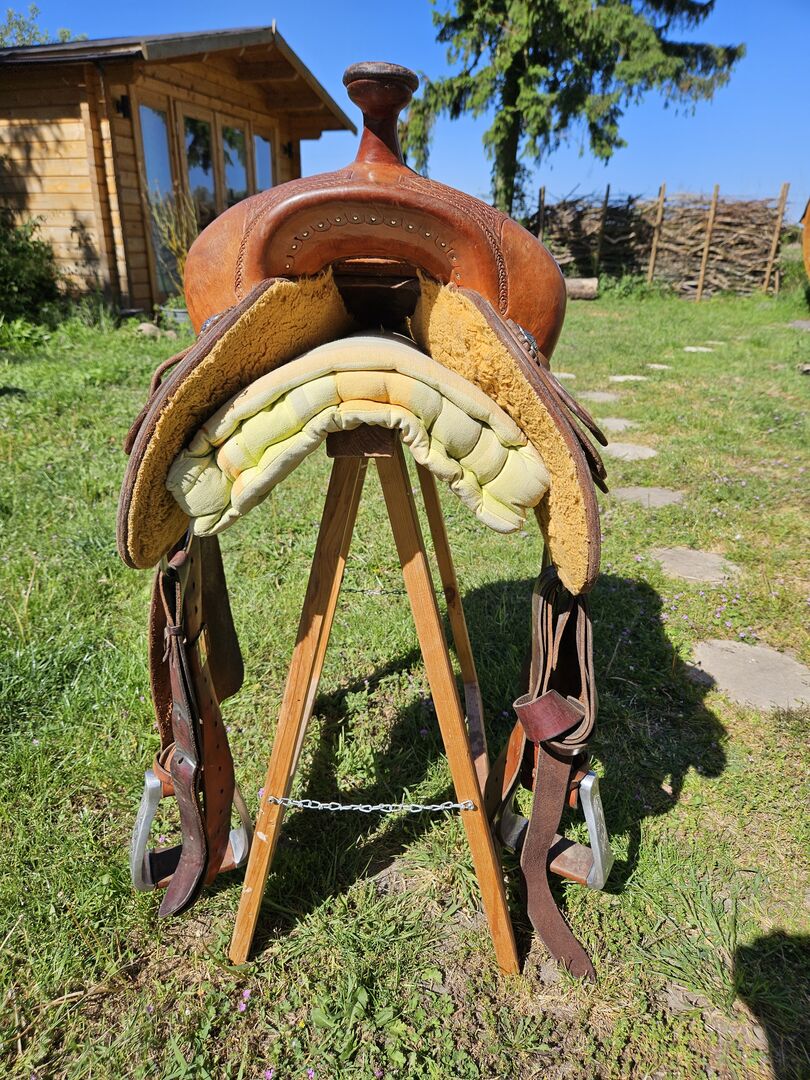 Diamond C Western Saddle - Jag erbjuder en Diamond C western sadel eftersom min häst har byggt upp mycket muskler och jag behöver en ny sadel. Det var på min travare, som har höjda mankar, fram till 4 månader sedan. Sadeln är fortfarande i perfekt skick, men har flera repor (se bilder). Stigbygelns bredd är 18 cm.