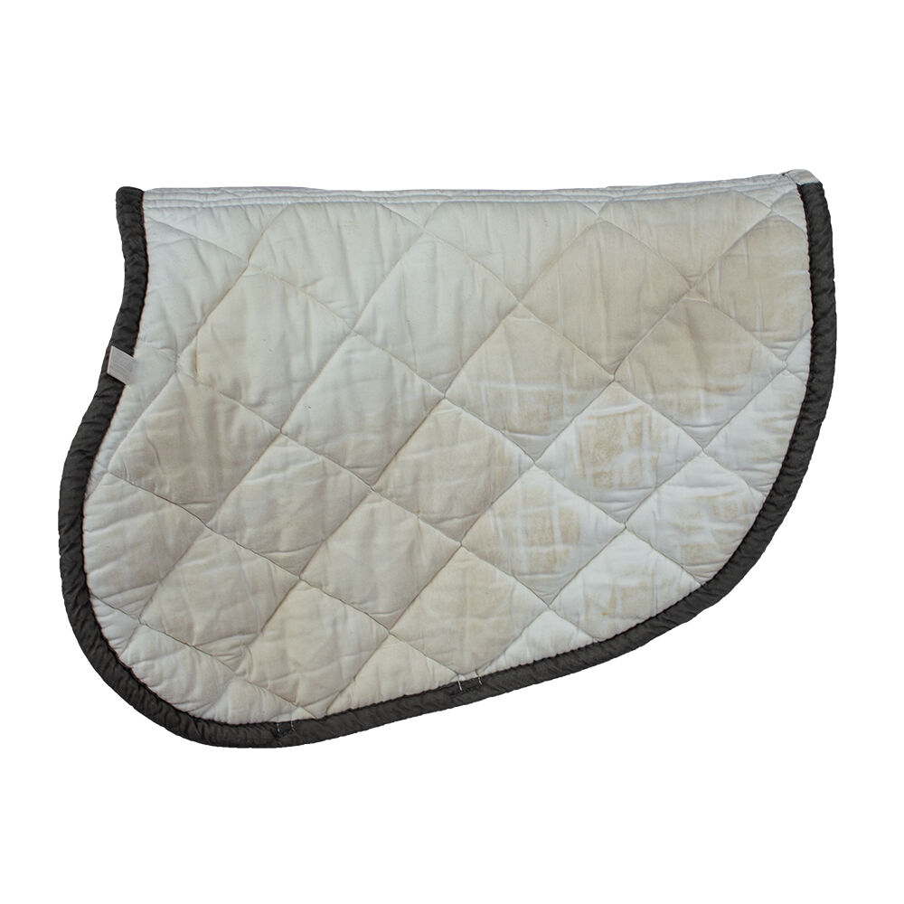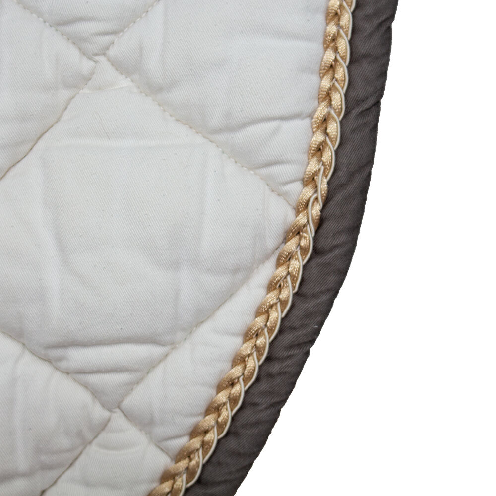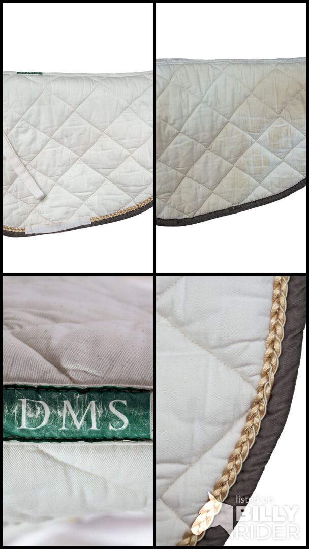 DMS Saddle Pad vit VS - Ett vackert VS-sadelunderlag från företaget DMS. Sadelunderlaget visar små tecken på användning. Undersidan av sadelunderlaget har en liten missfärgning. Det här fina vita sadelunderlaget är perfekt för träning och tävlingar. Den bruna bården med en gyllene flätad snodd och den speciella runda formen gör den hoppande sadelunderlägget till ett riktigt blickfång! Den är tillverkad av 100 % bomull.