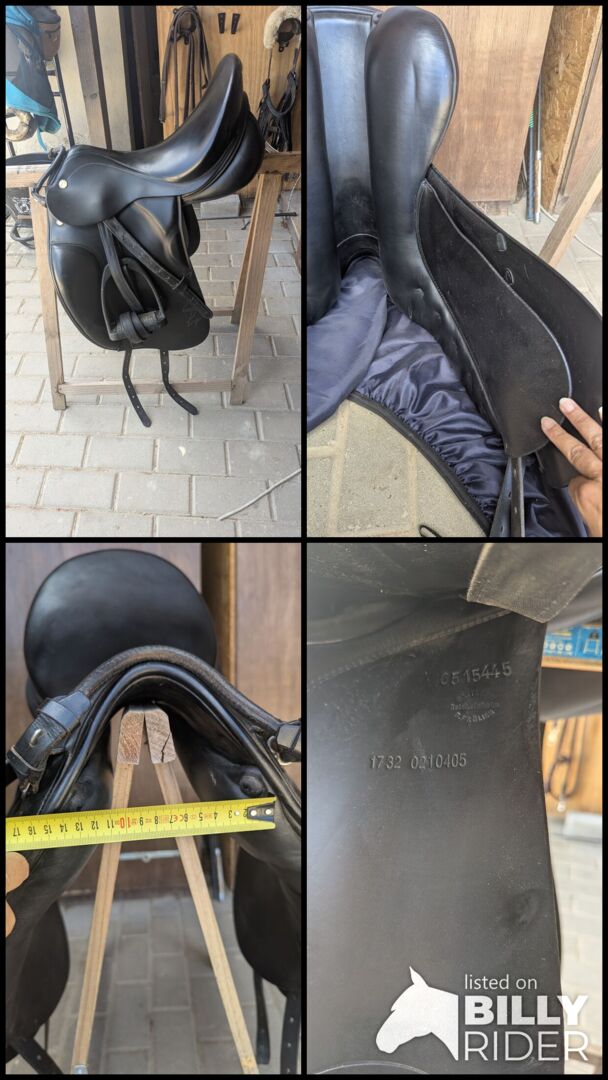 DOGE PRESTIGE DRESSYRSADEL 17 TUM - Jag köpte sadeln begagnad från TheSaddletree år 2023. Den är i riktigt bra skick. Den ursprungliga kammarens bredd har dock justerats. Den passar min häst perfekt, men tyvärr inte mig. Eftersom min häst gillar att göra oväntade sidvärtshopp köpte jag en med högre knäveck och har knappt använt den.
