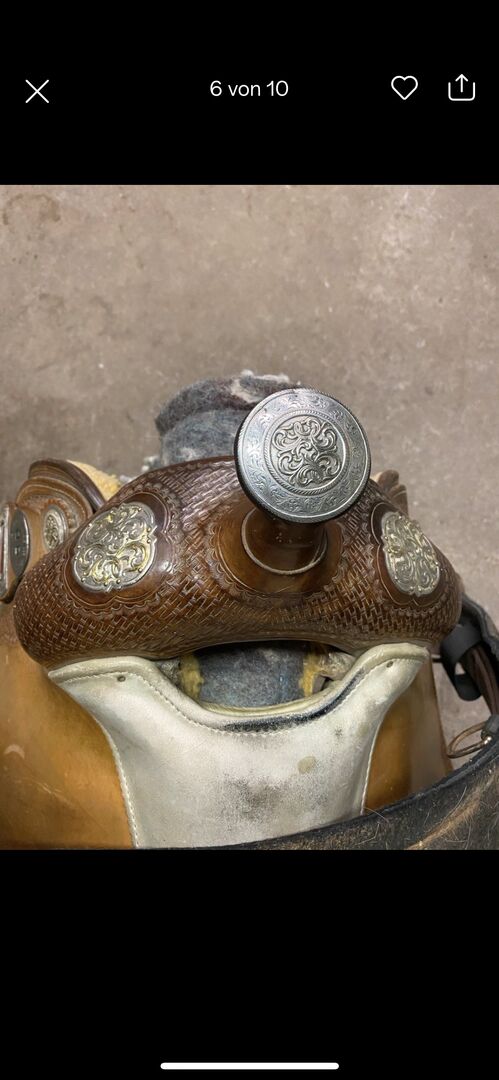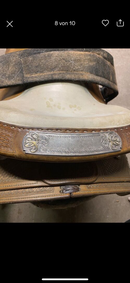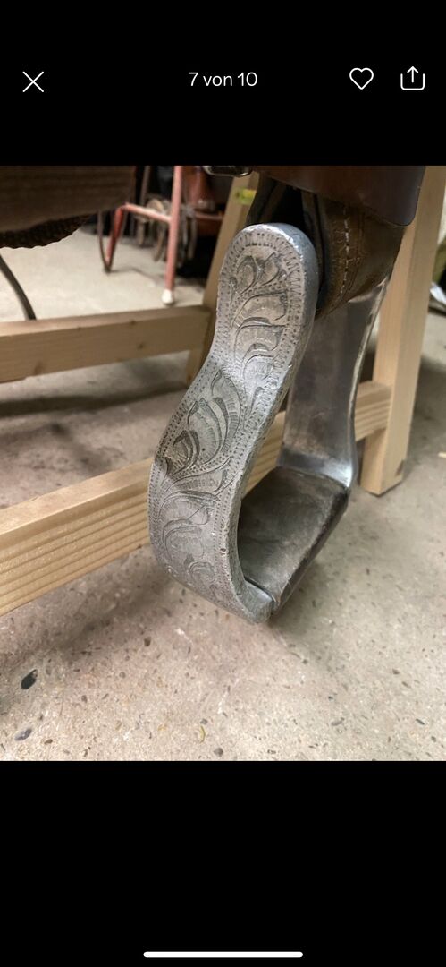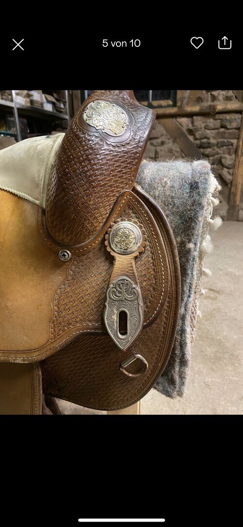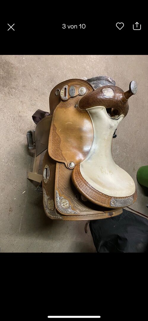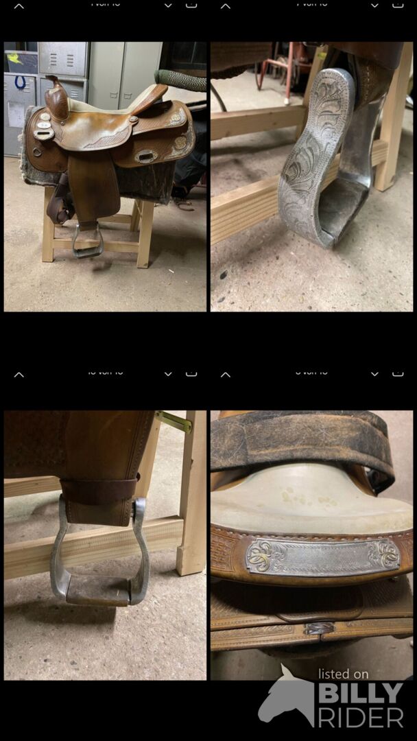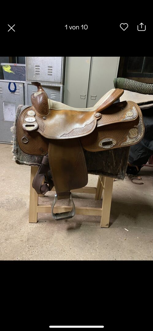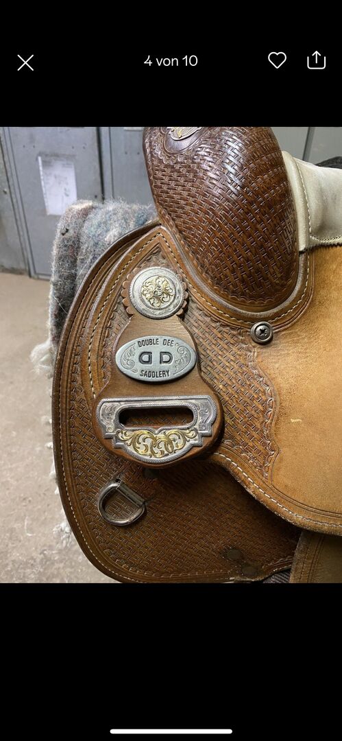 Double Dee western-sadel - Vacker och vackert stämplad western sadel med silverbeslag till salu. 16", inga skador, normala tecken på användning. För tung för mitt stora sto i längden och därför till salu på grund av omständigheter. Används på en Quarterhorse och Irish Cob.