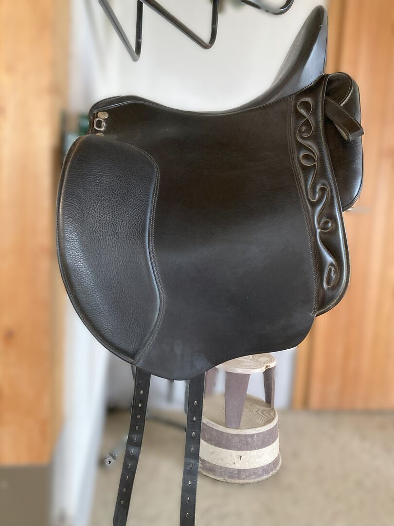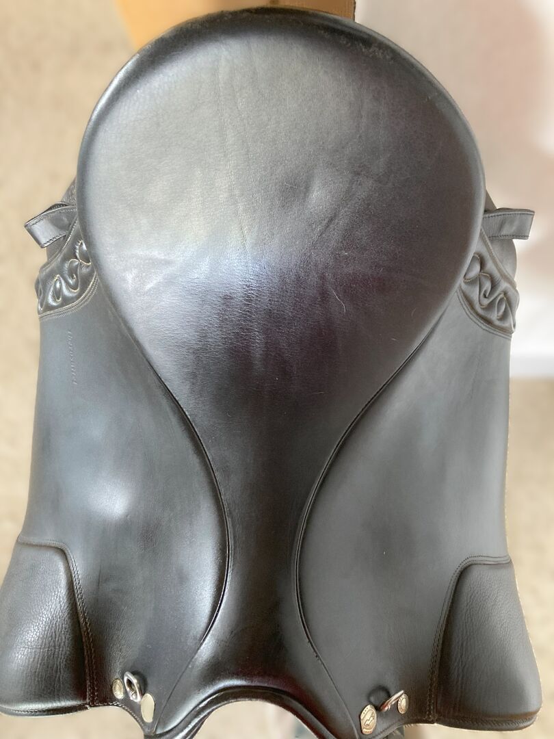 Dressyr Andaluz - Premium Line Dressyr - Slätt läder 17,5" svart - Superkomfortabel dressyrsadel som är idealisk för hästar med kort sadellängd, komfortpaneler säkerställer mycket bra viktfördelning, flexibel sadelgjord, justerbar, kammarbredd 32, med Secusad-system, dold Amazon-lösning, kardborrerullar, bröstplåtsringar, dekorativa sömmar, riden av en fritidsryttare i 7 år, årligt underhåll av en specialiserad sadelmakare från Iberosattel. Några små gnagmärken på sadelklaffen, i övrigt i toppskick. Långa sadelgjordsremmar.