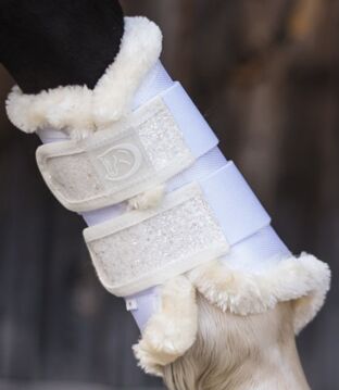 Dressyr Gaiters Glitter White Thoroughbred - Mjuka damasker av märket RidersChoice Fodrad med imiterad fårull Skick som ny, använd en gång, rengjord efteråt. Frakt möjlig mot betalning