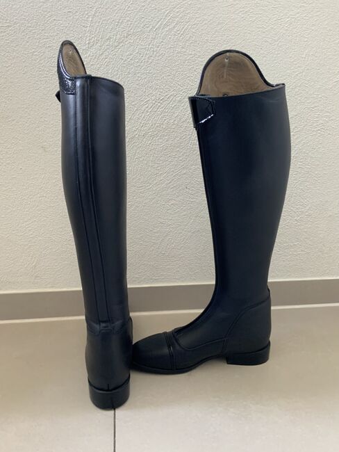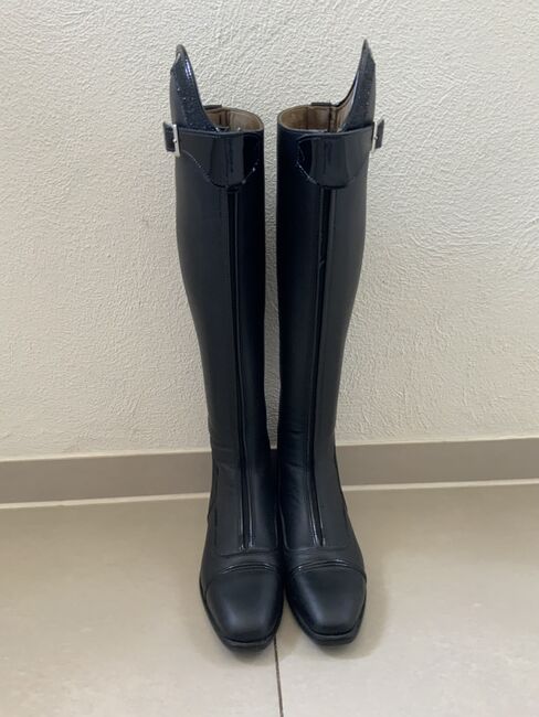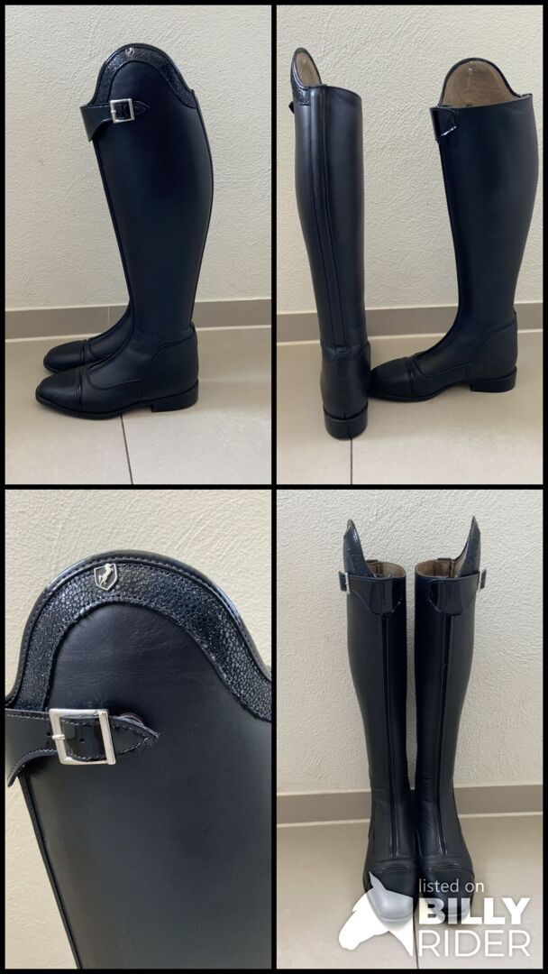 Dressyr ridstövlar - Vi säljer helt nya dressyrridstövlar storlek 40 med patentsömmar och patentspänne. Stövlarna är måttbeställda, men passar tyvärr inte och är därför till salu.stöveln är uppmätt till hålfoten 53 cm hög och insida 46 cm.vaden är 38 cm. stövlarna kan provas på. NP.var 679€!