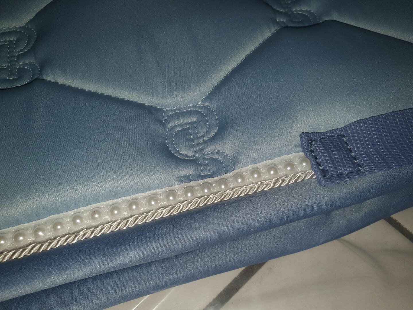 Dressyr Saddle Pad PS of Sweden ny - Hej, jag säljer här en helt ny sadelunderlag i en fin ljusblå färg med något mörkare kanter, en vit dekorativ snodd och ett parallellt vitt pärlband, något glänsande tyg och stoppning framtill för att ersätta de vanliga sadelunderlagen och ge en fast passform.