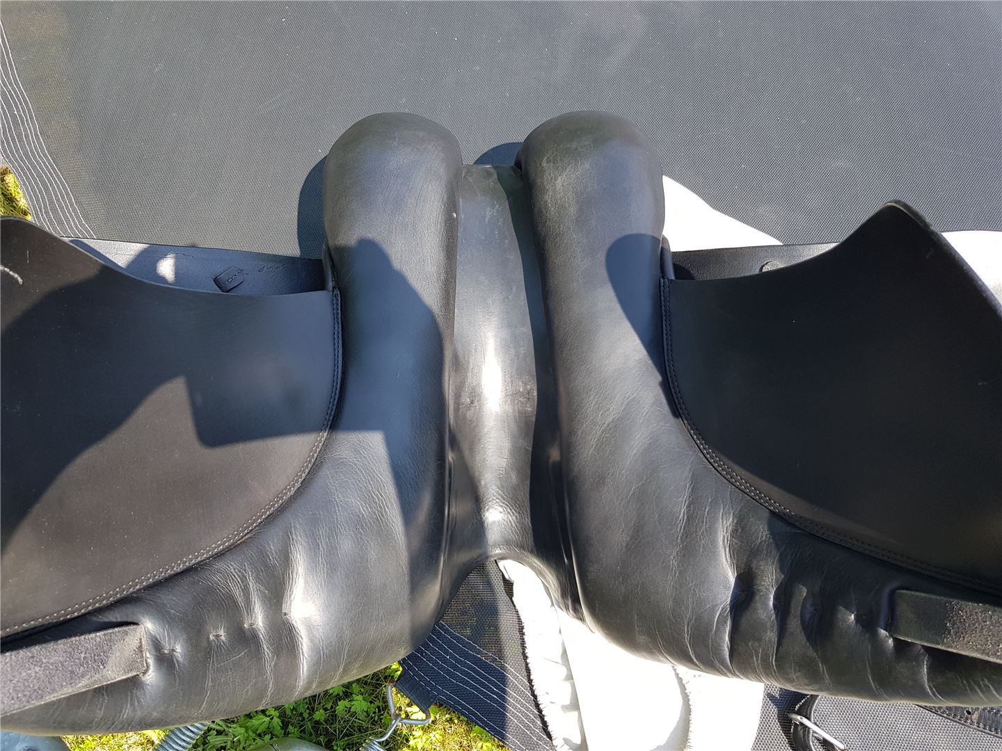 Dressyrsadel - Jag säljer min välskötta sadel. Den har normala användningsspår och inga skador. Färgen är ljusare på benet och sätet, vilket inte märks när du rider. Sömmen på sadelklaffen är från en ögla där sadelgjorden brukade gå igenom. Den är vadderad med bomullsull. Plats 17,5 och medium kammaren. Enligt sadelmakaren liknande konstruktion som Stübben Skandika.