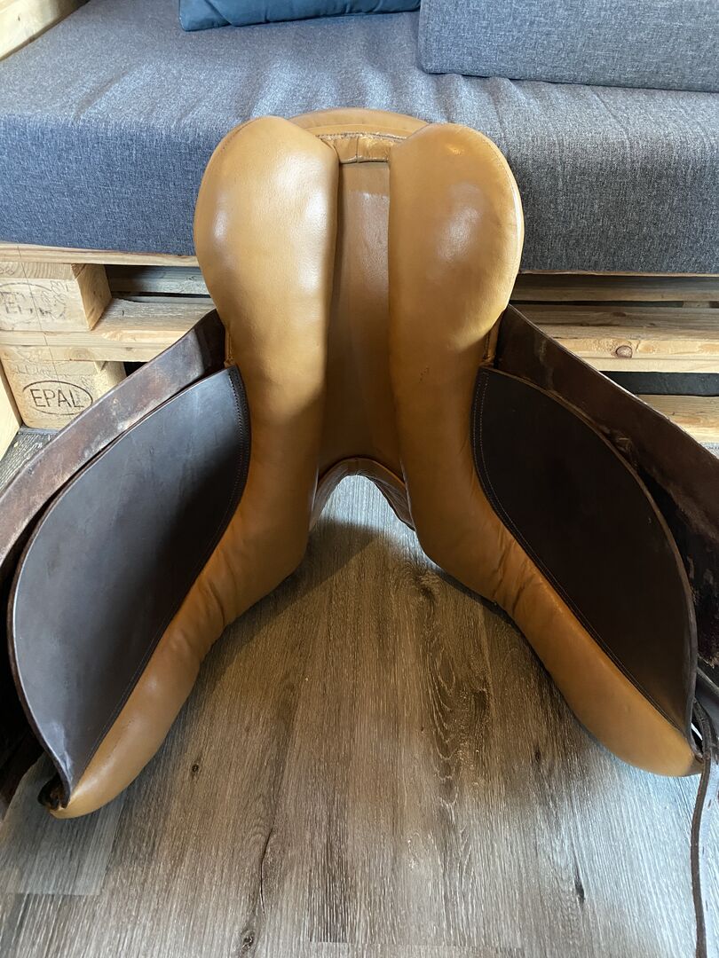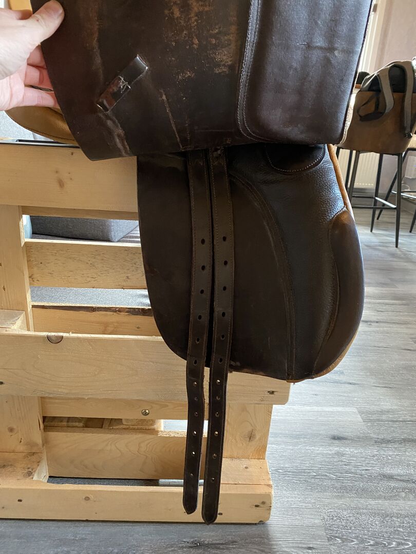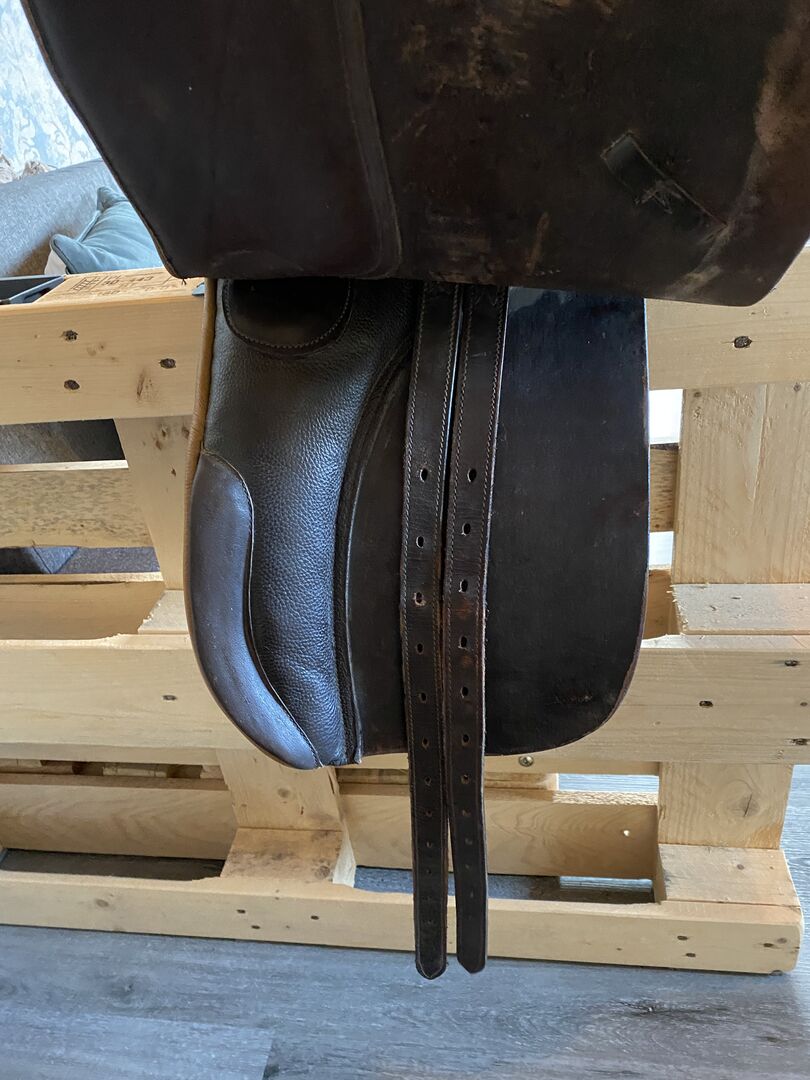 Dressyrsadel 17,5" - Säljer en begagnad men fortfarande i gott skick dressyrsadel. Tyvärr känner jag inte till märket längre, så jag säljer den som en no name. Den har en fin djup sits och är tvåfärgad, vilket gör den till ett iögonfallande blickfång. Strängarna är fortfarande i bra skick och kommer att hålla för evigt. Det finns små tecken på användning, se foto. Den skulle bara behöva en ny klädsel. Alternativt är det också bra för en trähäst.