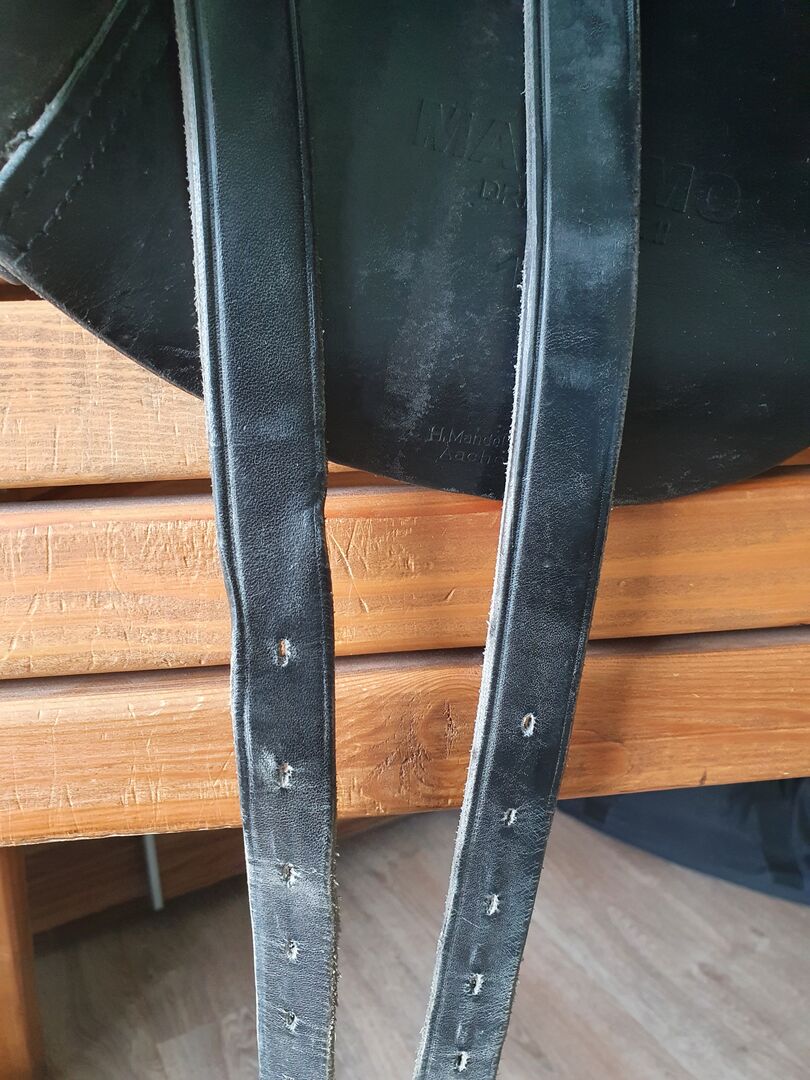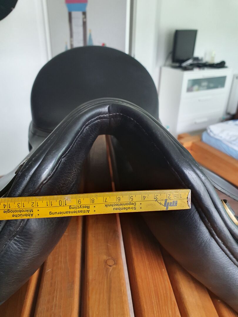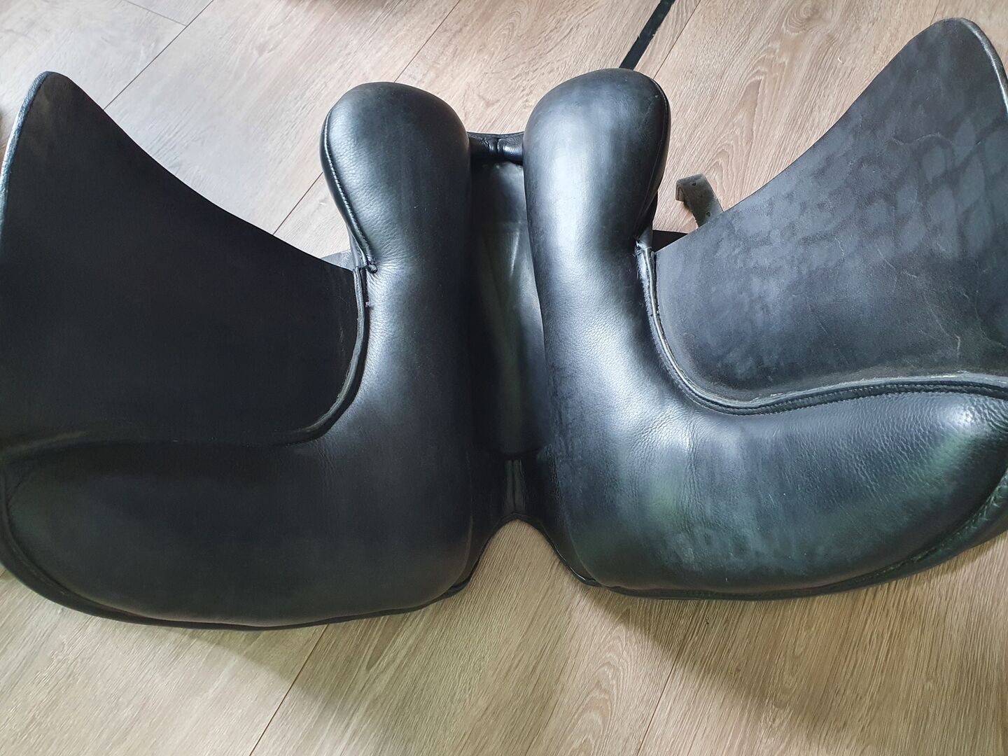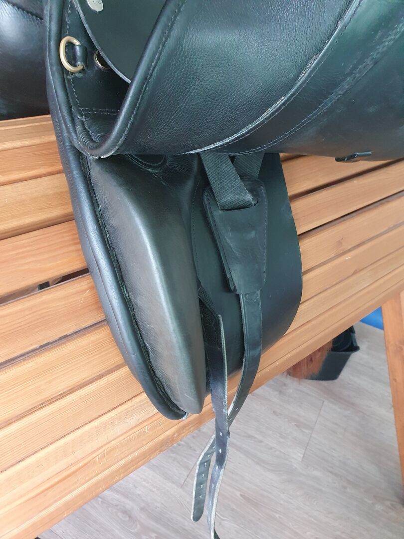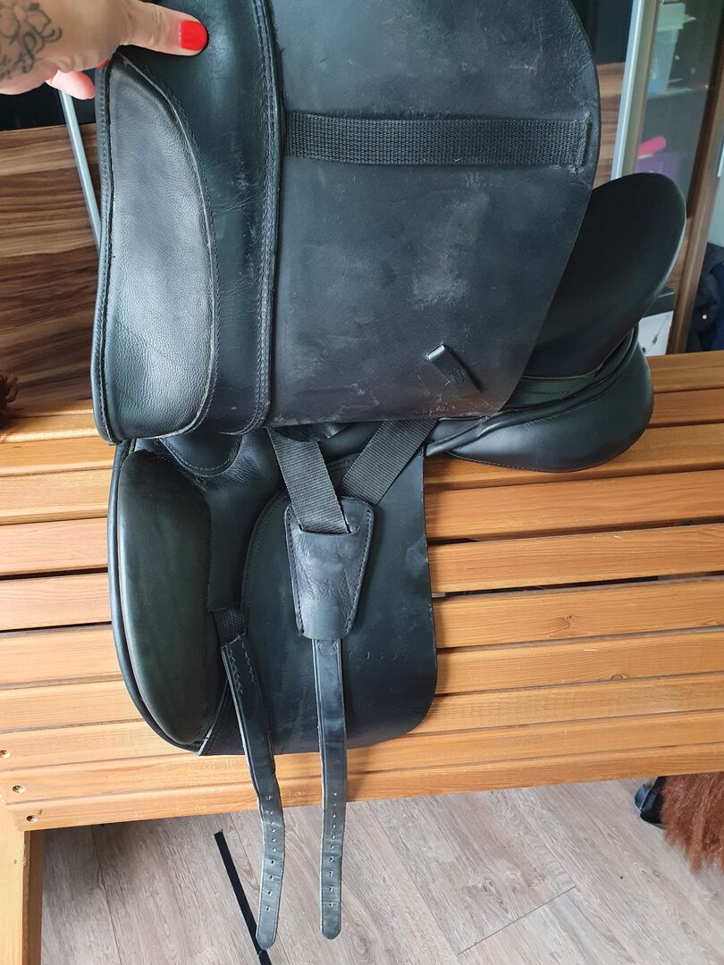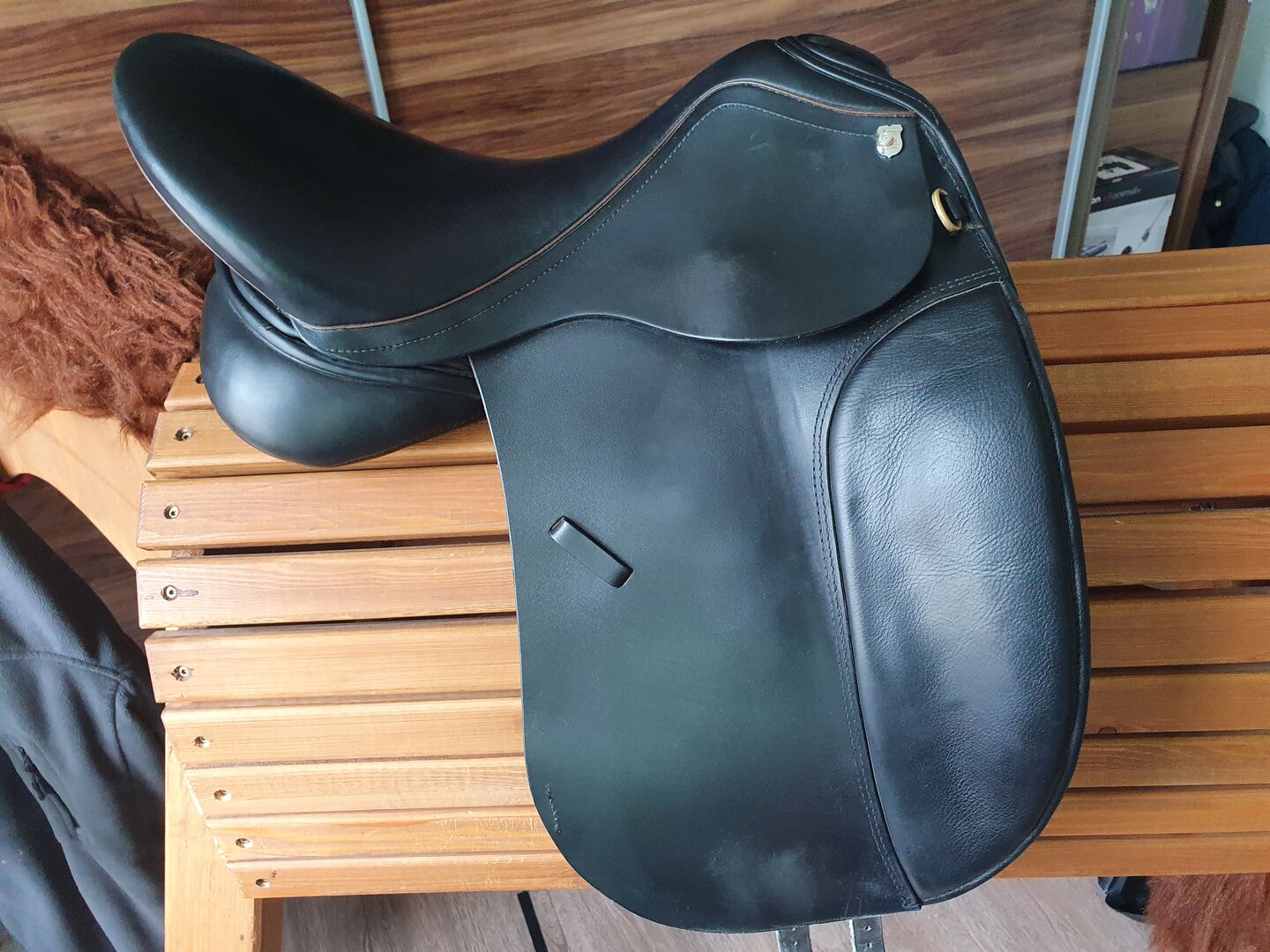 Dressyrsadel 17,5 tum - Jag säljer en begagnad dressyrsadel från Massimo i 17,5 tum. Den hade ursprungligen en 29 KW. Jag köpte den själv av en vän i stallet och använde den bara i tre månader. Innan dess användes den inte länge. Jag har fått nya Gerloc fingerborgar påsydda och den har gjorts lite smalare framtill. Den kan breddas till 31 KW. Jag sitter väldigt bra i sadeln. Det visade sig dock att den inte är perfekt för min häst. Den är i mycket gott skick. Det finns några repor på sadelklaffarnas undersida (hur de uppstod är ett mysterium för mig). Förmodligen från stövlarna. Den främre remmen är lite vriden på grund av trianglarna. Se bilder.