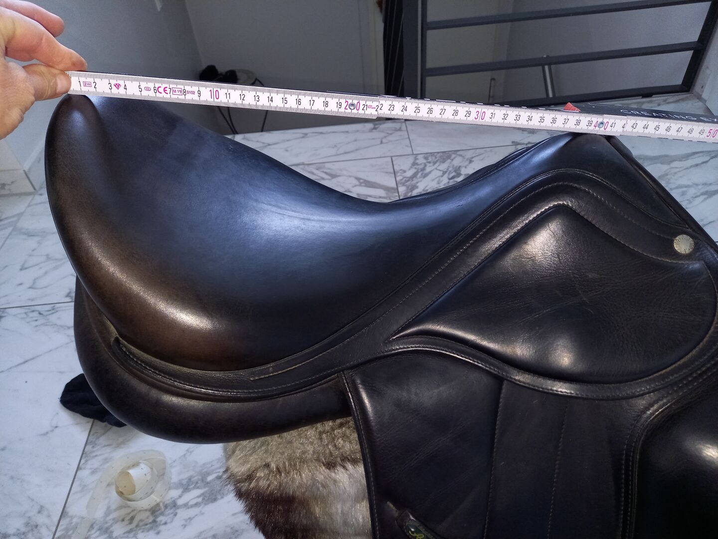 Sadeln har en sits på 17,5'' och en normal sadelklafflängd. Eftersom den är bakåtskuren ger den hästen god axelfrihet och den djupa sitsen ger ryttaren en mycket bra ridkänsla och optimalt stöd. Presenteras regelbundet till sadelmakaren och utvärderas därefter. Sadeln är i mycket gott skick, utan några sprickor eller revor! Den matchande neoprengrimmen 75 cm finns också tillgänglig. Vid behov finns även stigbyglar och remmar.