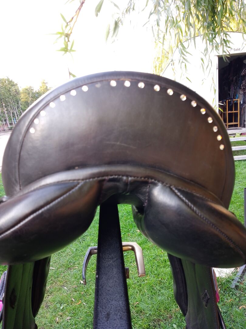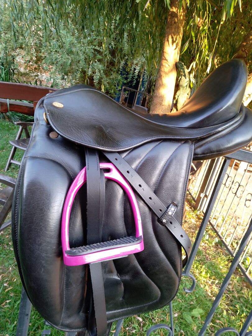Dressyrsadel - Jag säljer min begagnade men välskötta dressyrsadel av Eric Thomas. Den har 17,5 tum och passar för korta hästar. Jag säljer den komplett med stigbyglar, kort sadelgjord och schabrak.