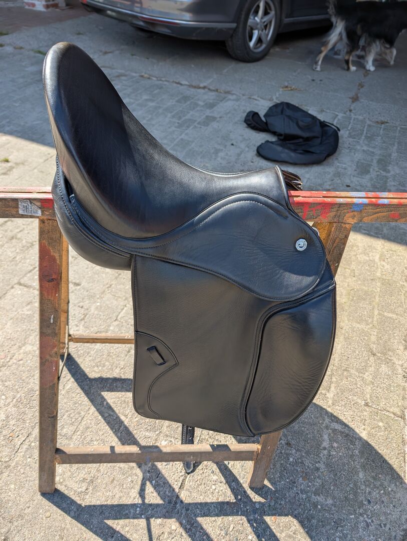 Dressyrsadel Butterfly Uta Gräf 18" låg sits svart - På grund av ett nytt köp erbjuder jag en super bekväm butterfly sadel modell Uta Gräf i 18", helt svart och låg sits. Speciellt lämplig för hästar med hög manke eftersom detta område är perfekt utskuret. Dubbelt läder, vilket ger betydligt mer stöd. Beskrivning från återförsäljaren:
