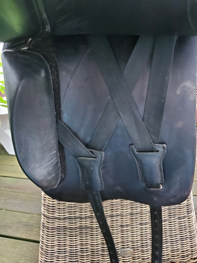 Dressyrsadel Butterfly Uta Gräf - Mycket elegant och bekväm sadel med butterfly-teknik, dvs ingen fast sadelstam utan ett gångjärnssystem genom vilket sadeln anpassar sig efter hästens rygg. 18'' sits, går lite mindre. Privat försäljning, därför ingen retur, garanti eller ansvar för defekter.