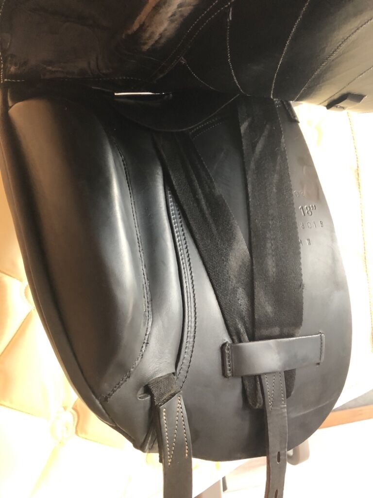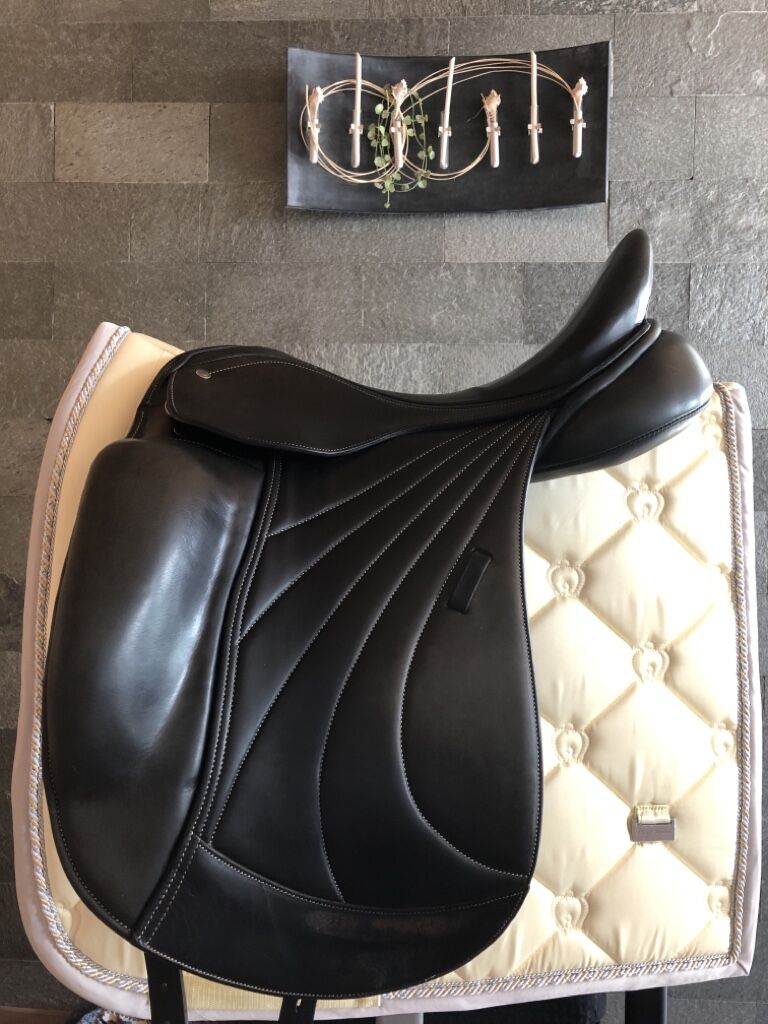 Dressyrsadel Colbert Brothers "Model Jasmin - Här kan du köpa en dressyrsadel från Colbert Brothers "Model Jasmin". Sadeln har för närvarande en bredd på 33 och kan justeras av sadelmontören. Sadeln är justerbar i kyla. Den har en extra bred sadelkanal (framsidan ca 16 cm, baksidan ca 8 cm) och är supermjukt vadderad. Sätesstorleken är 18" enligt stämplingen i sadeln. Den är mycket bekväm att sitta på. Utseendet förstärks av vita sömmar. Sadeln är begagnad och har spår av användning, se bilder. Den har alltid varit välskött och levereras med ett matchande sadelöverdrag.