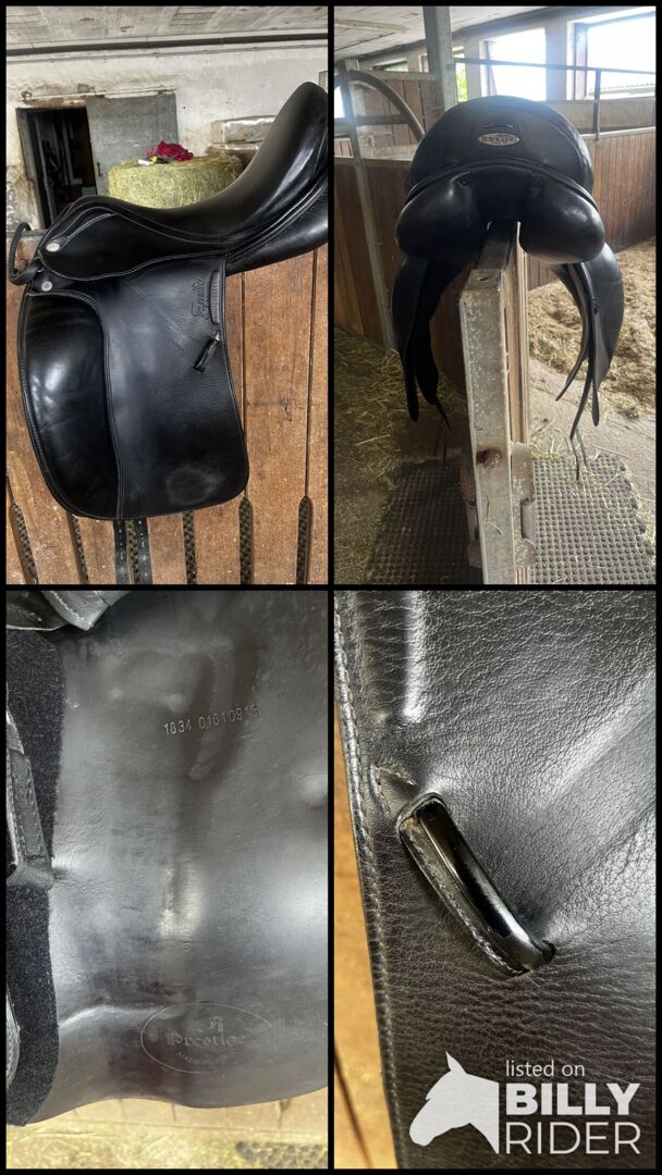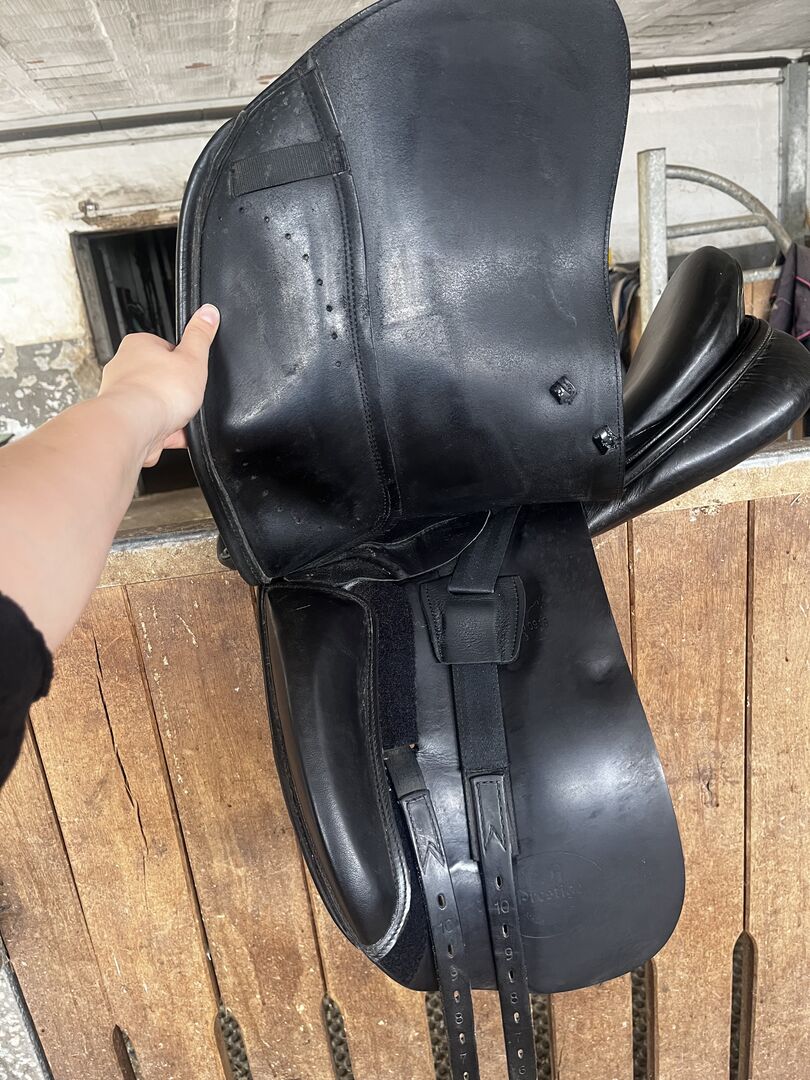 Dressyrsadel Emilio - Jag säljer en Emilio dressyrsadel i bra skick. Denna sadel är tillverkad av Prestige för Euroriding. Sadeln har kardborrepaneler och duplicerat läder. Sadeln har nyligen blivit vadderad.