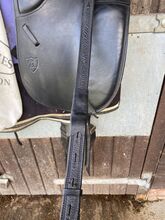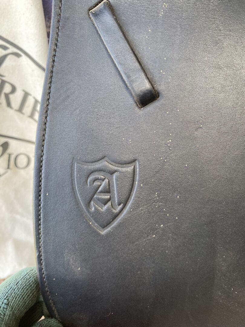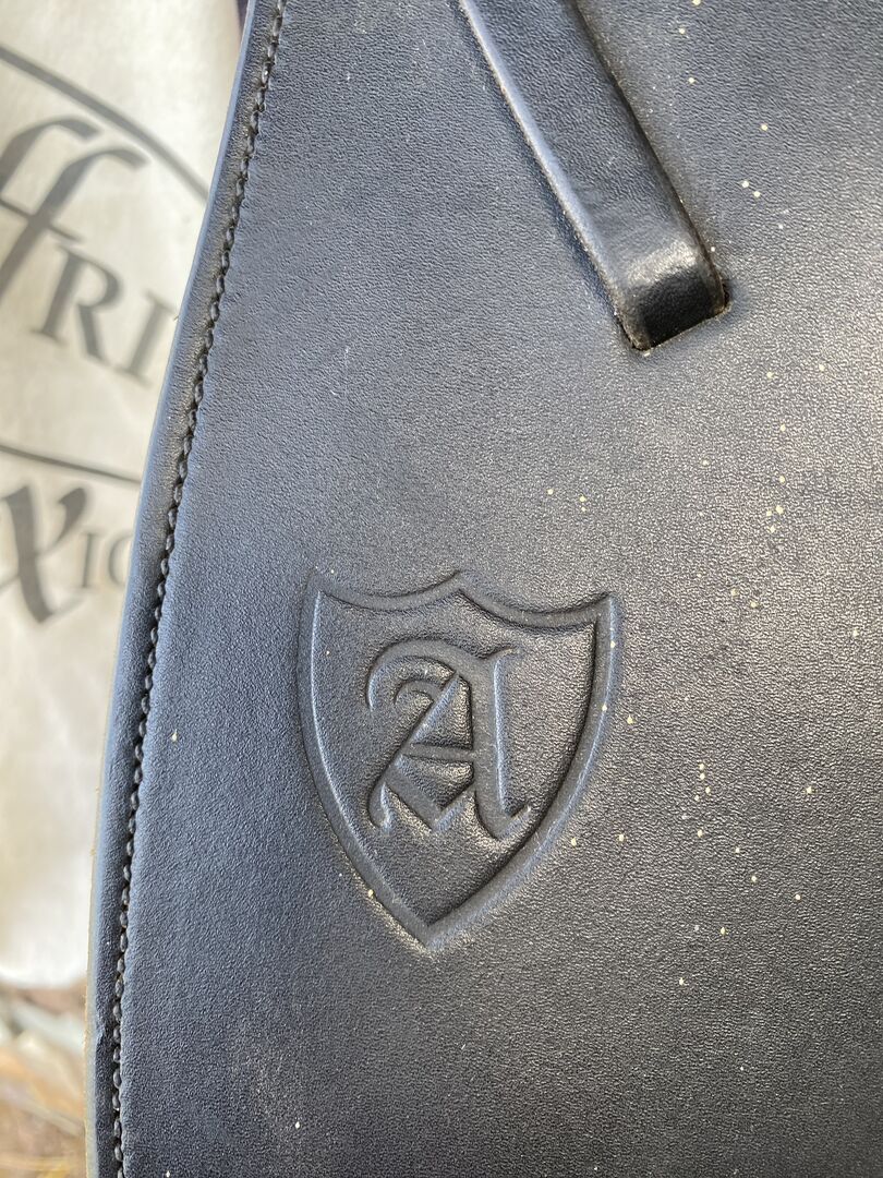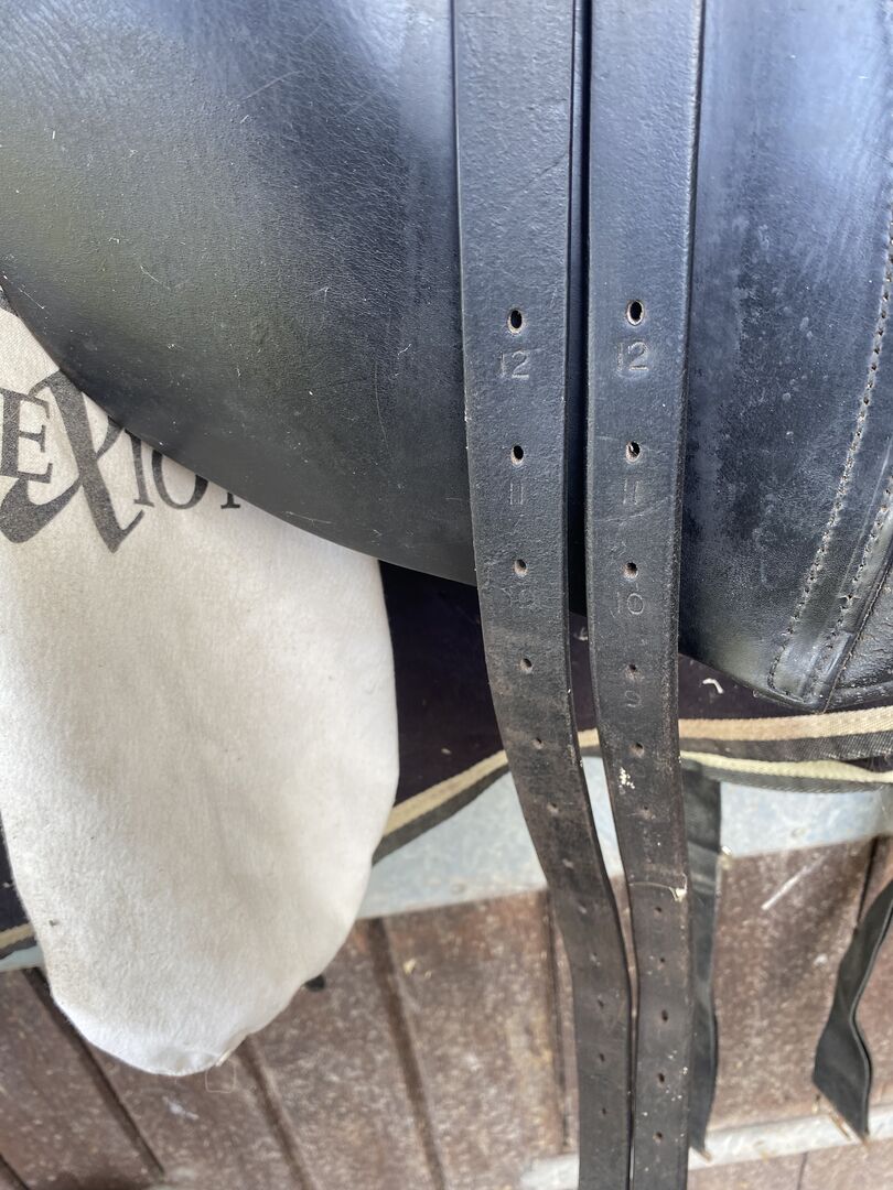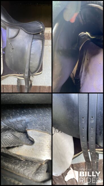 Dressage saddle 17 inch seat, black leather D to D 8 inches, 4 1/2 inches on inside of pommel. Stirrup bar is stamped with M , so comes up as medium saddle .