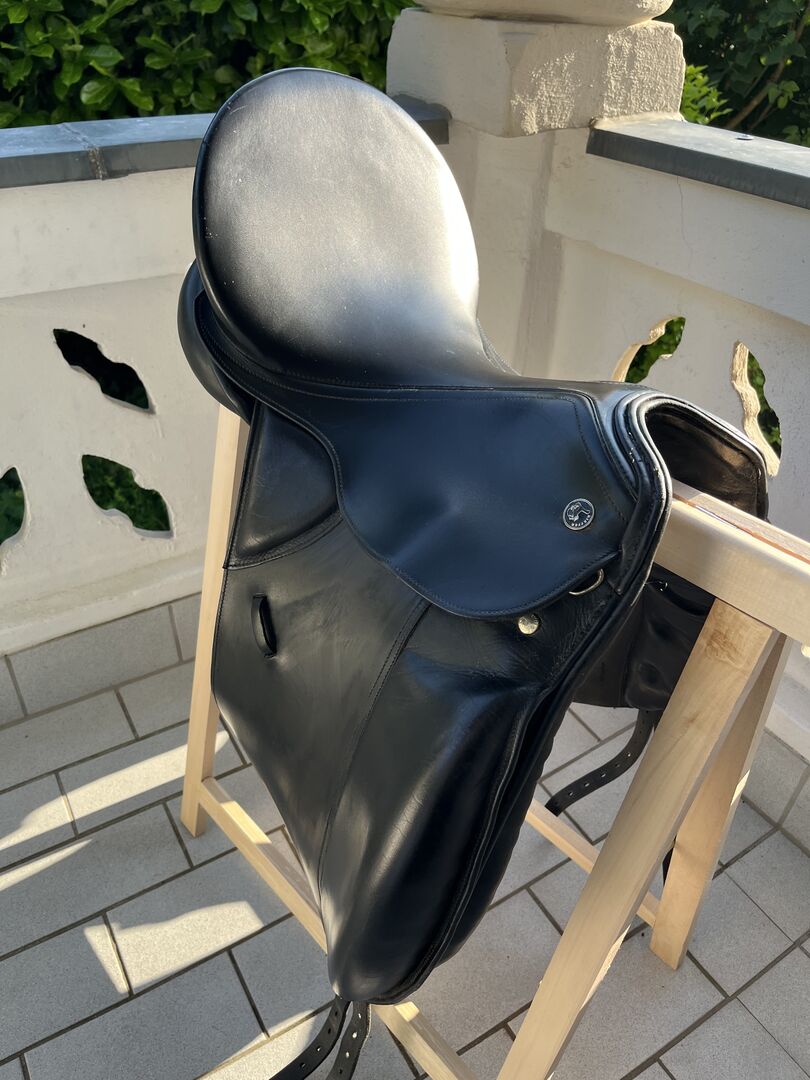 Dressyrsadel från Kieffer 17,5" - Begagnad dressyrsadel. Jag köpte den här sadeln 2025, den var vadderad av sadelmakaren 2024. Tyvärr passar den inte min häst. Stigbyglar, stigläder och gördel är nya från FB.