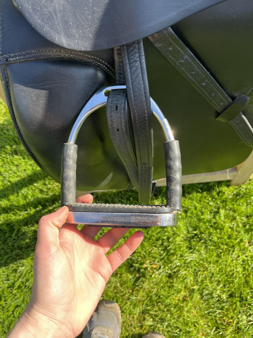 Dressyrsadel, hoppsadel - Sälj mycket välbevarad dressyrsadel av BR modell Chopin, 17'. Sadeln är tre år gammal, mycket välskött och har kontrollerats varje år av sadelmakaren och stoppats i enlighet med detta. Sadeln kan säljas med stigbyglar och Sprenger säkerhetsbyglar (liten storlek, 11 cm) och sadelkuddar. Sadeln satt på en häst med mycket vrist.