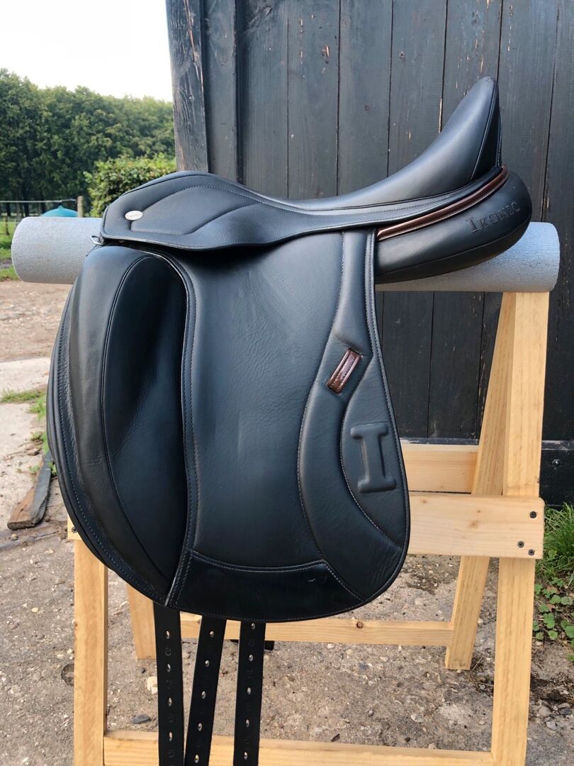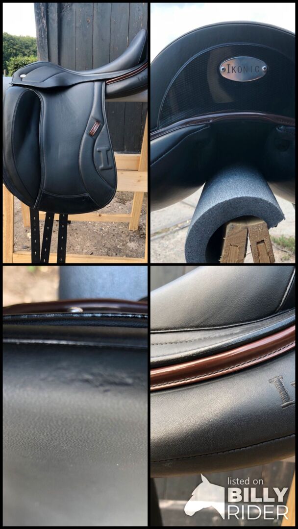 Dressyrsadel Ikonic Pro Evolution 17" (EVOD02) - Jag erbjuder min Ikonic Pro Evolution dressyrsadel mono flap (EVOD02) i färgen svart med bruna detaljer. Den köptes i oktober 2021 men användes fram till mitten av 2023. Tyvärr måste jag ge bort den eftersom min häst inte längre är ridbar. Sadeln är mycket bekväm och erbjuder lyx för både ryttare och häst. Den visar naturliga tecken på användning, till exempel genom stigbygelskinnen, men har alltid varit väl omhändertagen, varför den fortfarande är i gott skick. Sadeln har också en liten fläck (ca 2 cm) på sadelklaffen, som knappt syns (se bild). Sadeln erbjuds inklusive sadelklaffar och en annan kotlettplatta (W), MW kotlettplattan är för närvarande monterad.